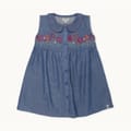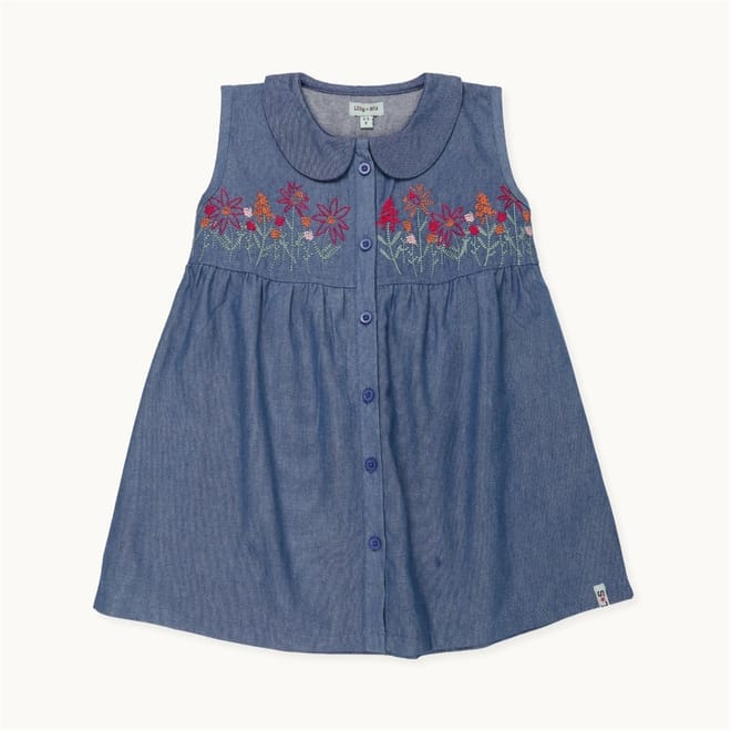 This Lilly & Sid A-line dress features a charming floral pattern and a classic Peter Pan collar. The knee-length design is complemented by a collared neck and a straight hem. The dress is sleeveless and offers a regular fit, with button closure adding a touch of elegance. Delicate embroidery enhances its appeal, making it a delightful choice for various occasions. -