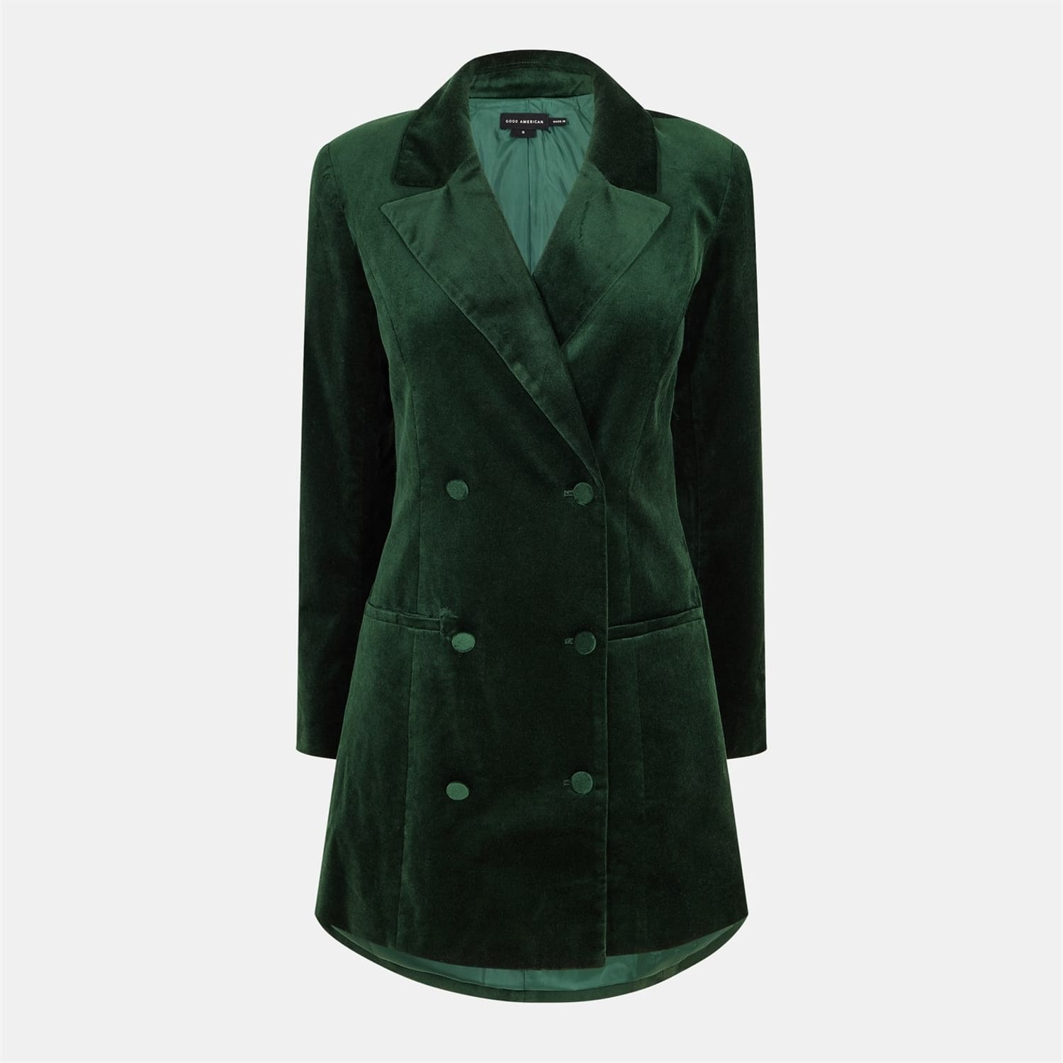 The Good American blazer dress is a sophisticated mini-length piece featuring a lapel collar and a button closure. Designed with a curved hem, this solid pattern dress offers a regular fit and long sleeves, making it a stylish choice for any occasion. -