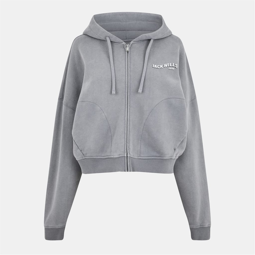 This Jack Wills sweatshirt jacket features a relaxed fit with a hooded neckline and a convenient zipper closure. The drop shoulder design and ribbed cuffs add a touch of style, while the ribbed hem ensures a snug fit. The short length and wash pattern make it a versatile addition to your wardrobe. Finished with a logo embellishment, this jacket combines comfort and fashion effortlessly. -