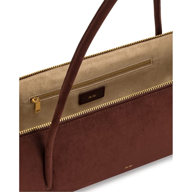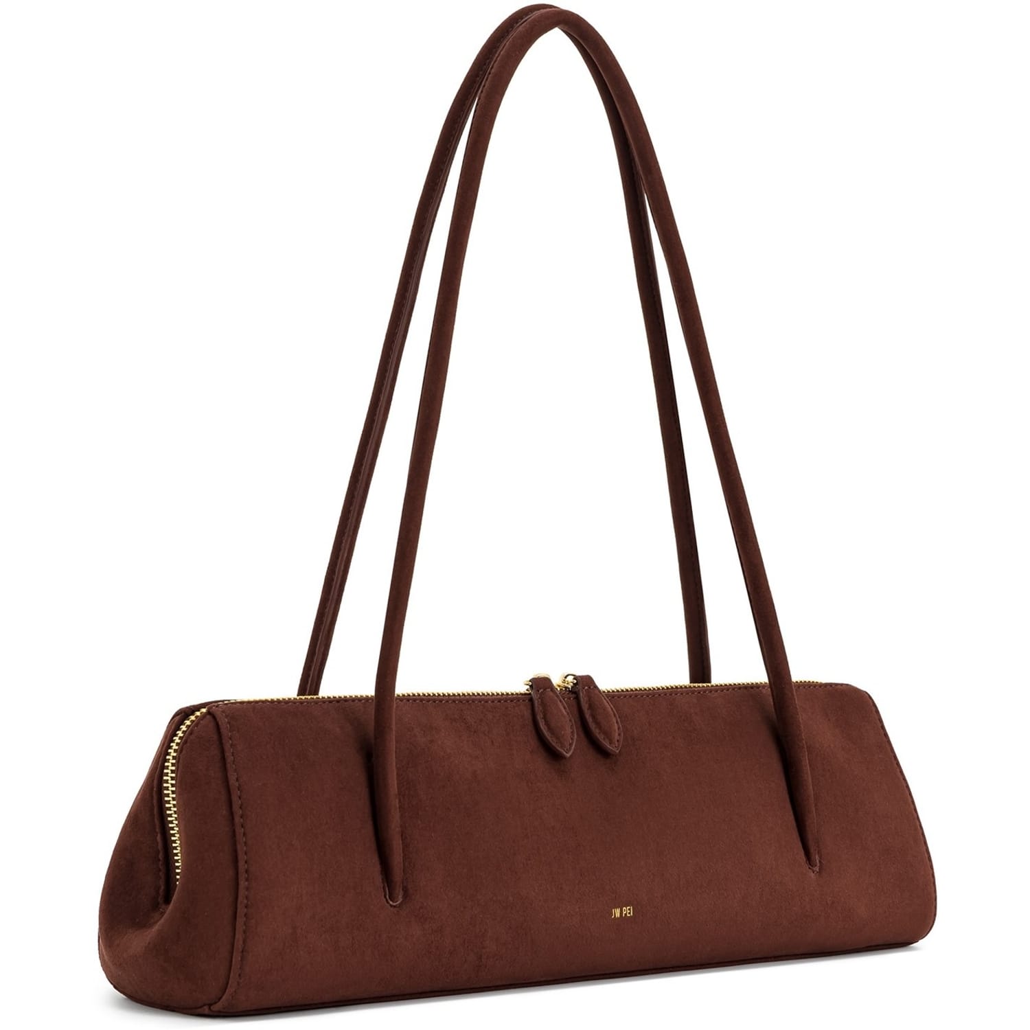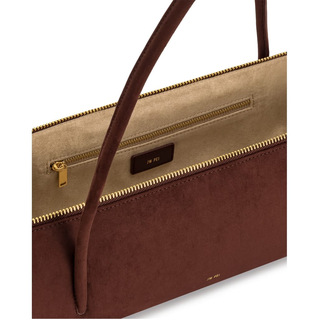 The JW Pei Novak Baguette Bag is a stylish accessory featuring a zipper closure and a shoulder handle for easy carrying. This elegant bag includes a zipped pocket for added convenience and showcases the brand's logo, making it a chic addition to any collection. -