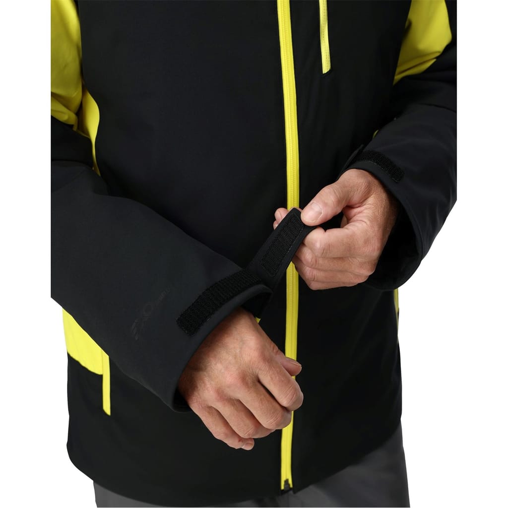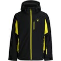 This Spyder ski jacket features a hooded neckline and a regular fit, perfect for winter adventures. The jacket showcases a stylish color block pattern and includes a zipper closure for convenience. A straight hem adds to its sleek design, while the logo embellishment provides a touch of brand identity. -