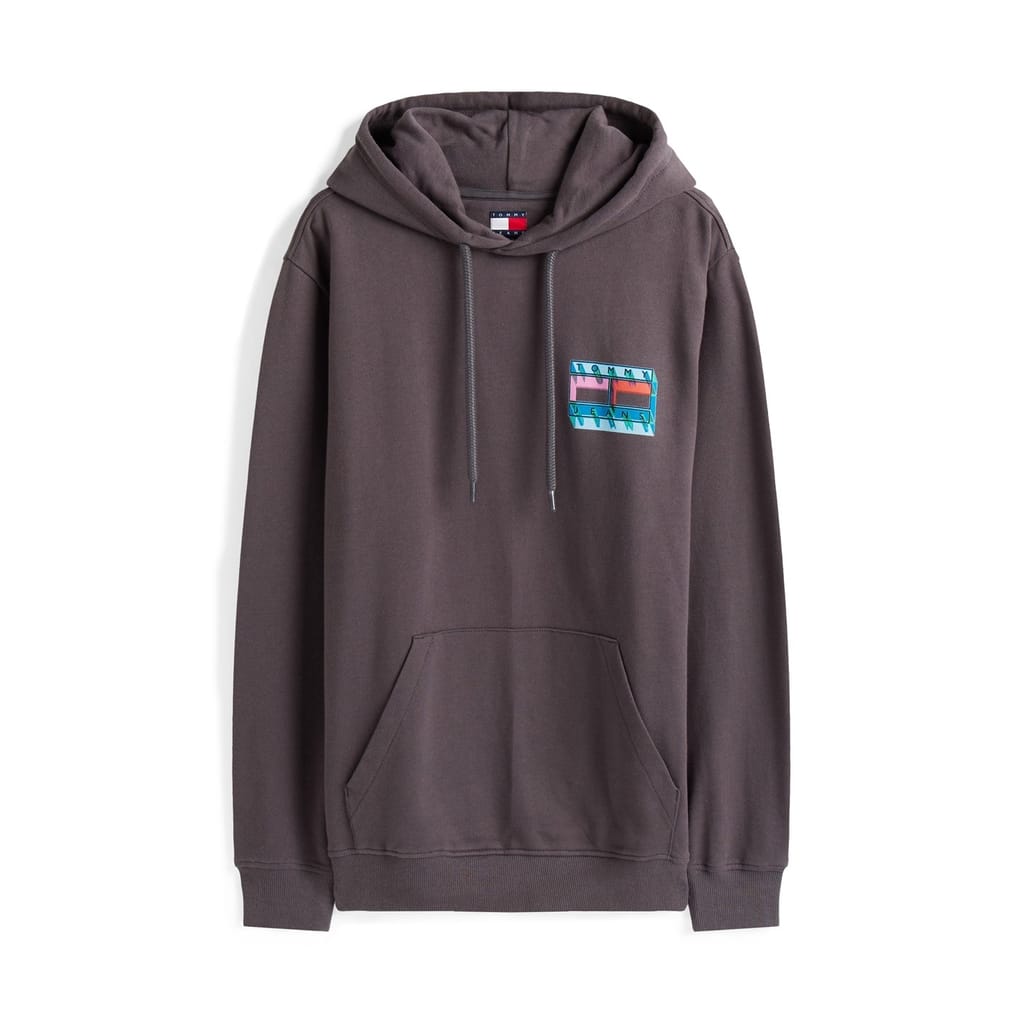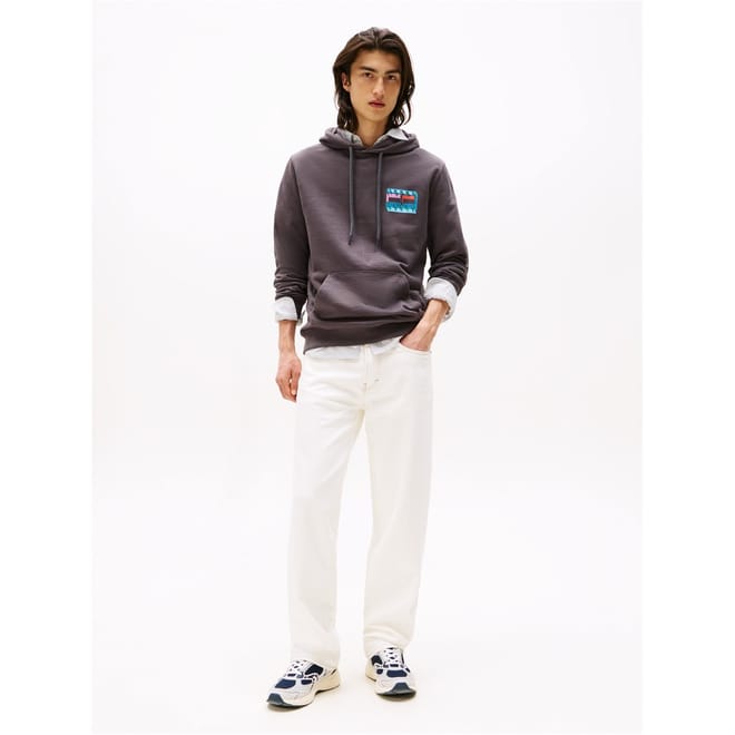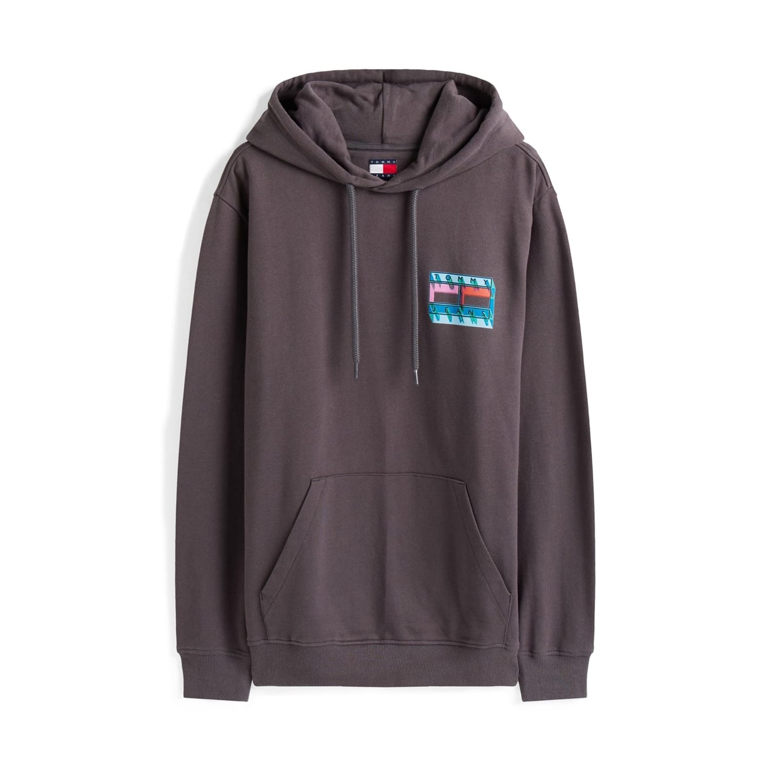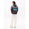 This Tommy Jeans top features a hooded neck and long sleeves with a drop shoulder design. It offers a regular fit and includes a drawstring closure. The top is adorned with a graphic print and a front logo, complemented by a kangaroo pocket. Ribbed cuffs add a touch of detail to this stylish piece. -