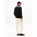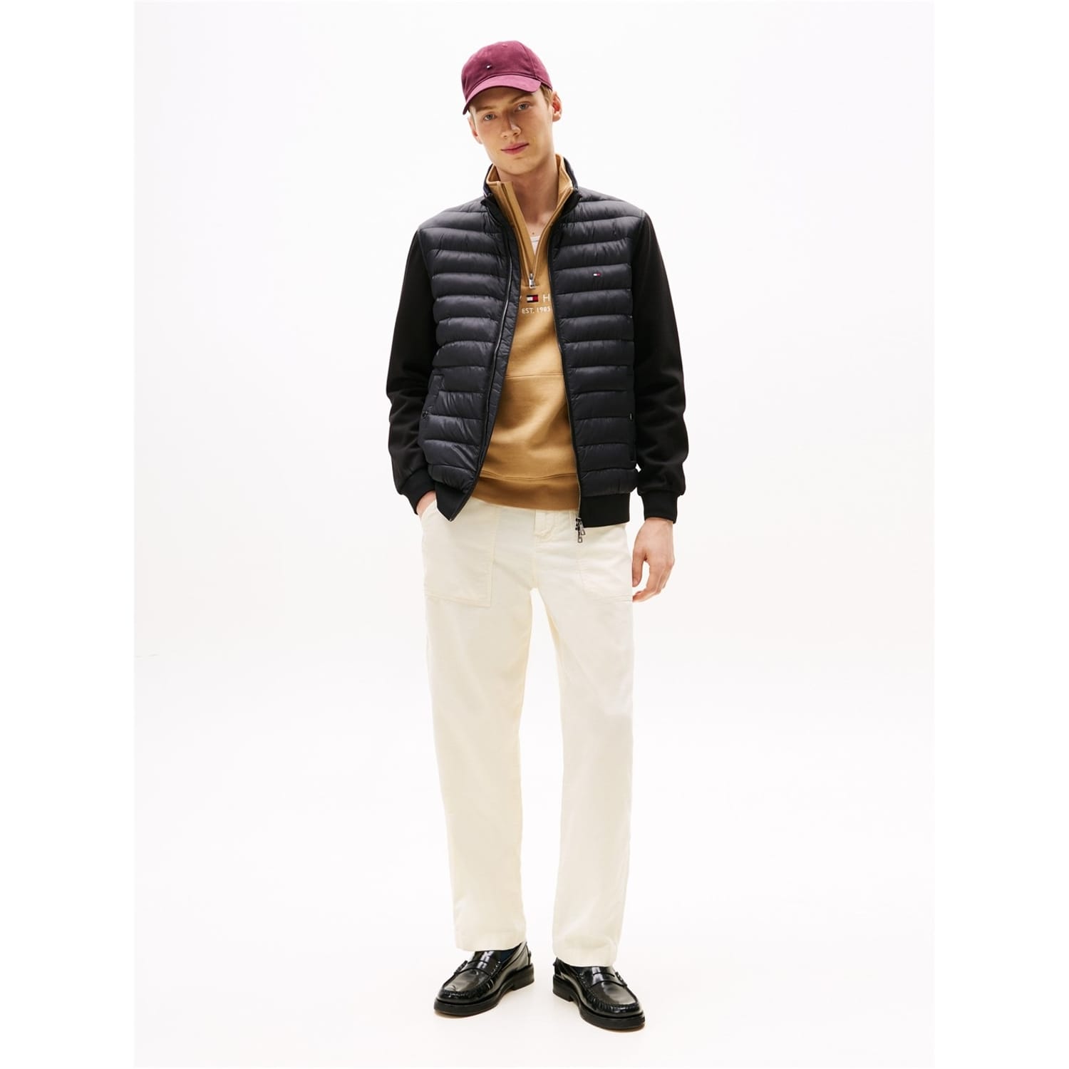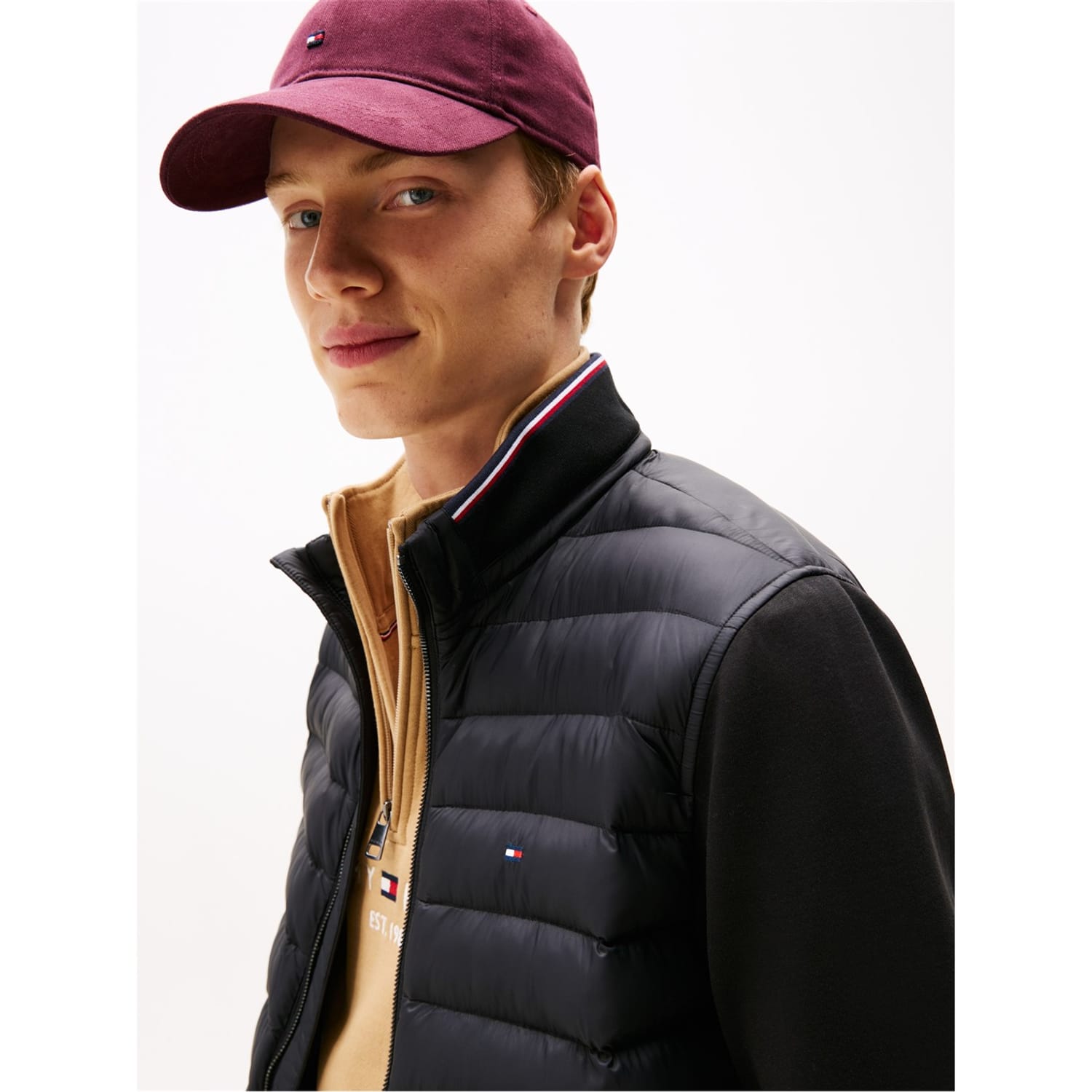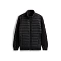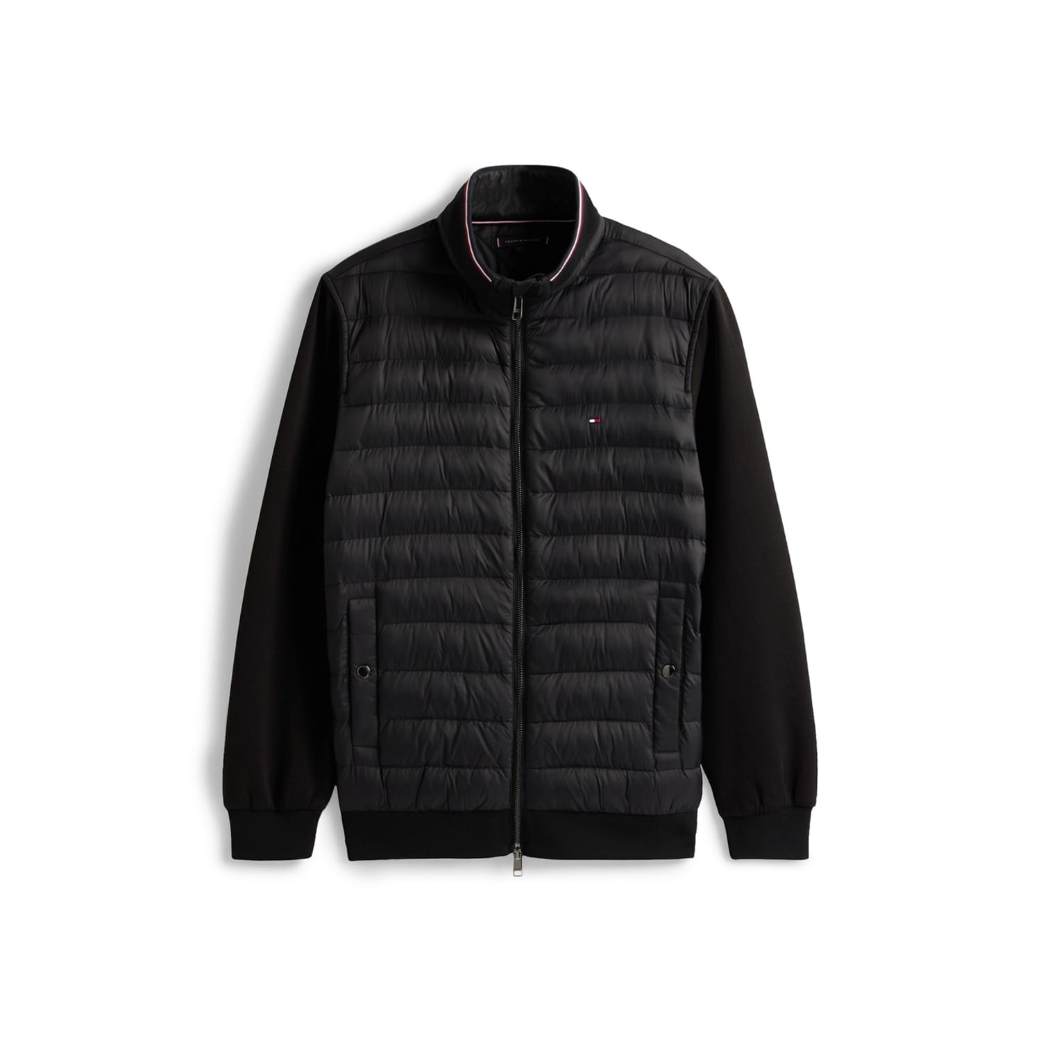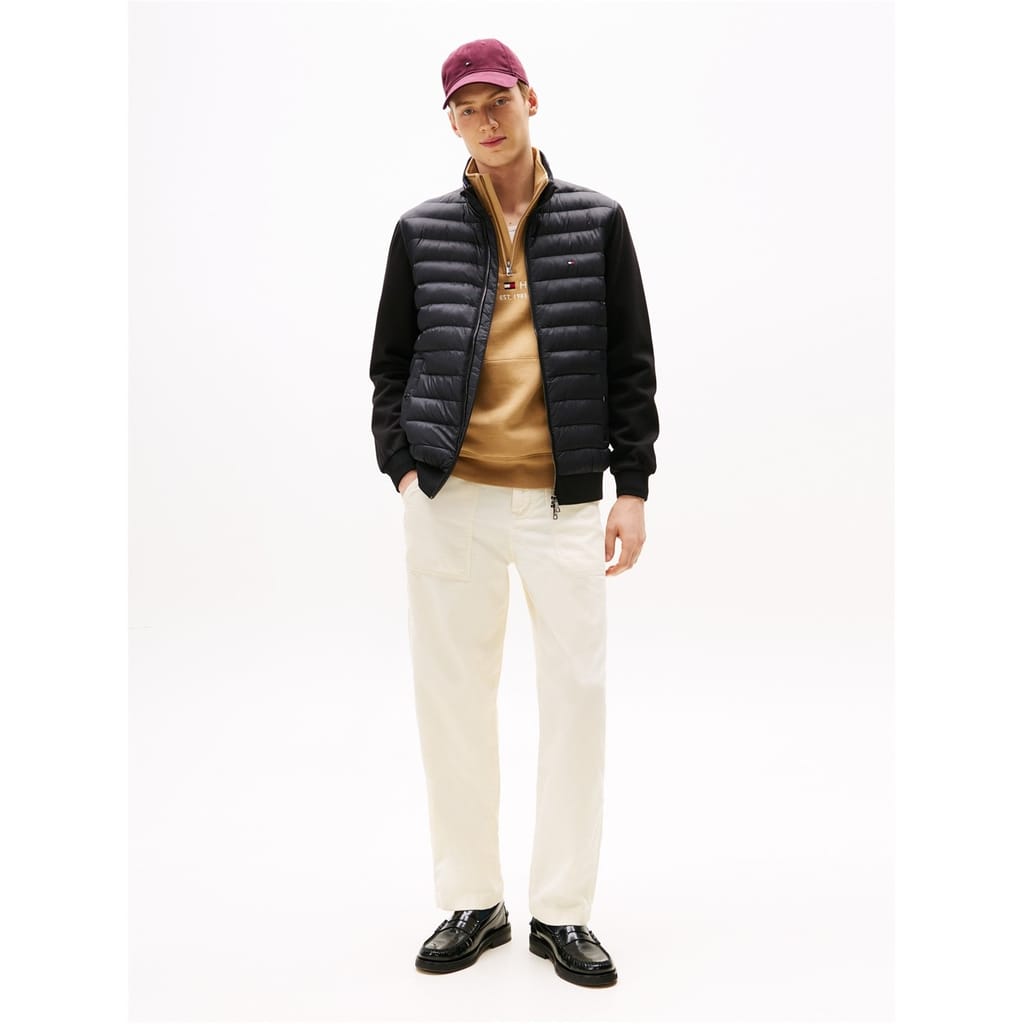This Tommy Hilfiger hybrid jacket features a solid pattern with a regular fit. It is designed with a zipper closure, ribbed cuffs, and a ribbed hem, offering a sleek and functional style. -