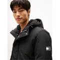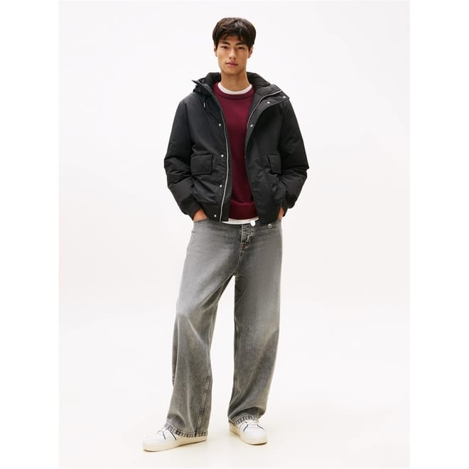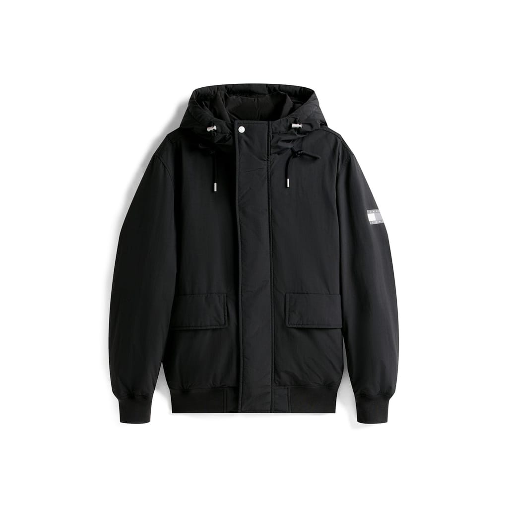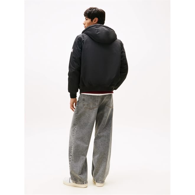 This Tommy Jeans bomber jacket features a short length and a classic bomber collar. It offers a regular fit with a solid pattern, complemented by a ribbed hem and ribbed cuffs. The jacket is equipped with a zipper closure and snap buttons, adding functionality. Flap pockets provide practical embellishments, making it a versatile addition to your wardrobe. -