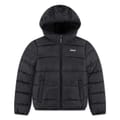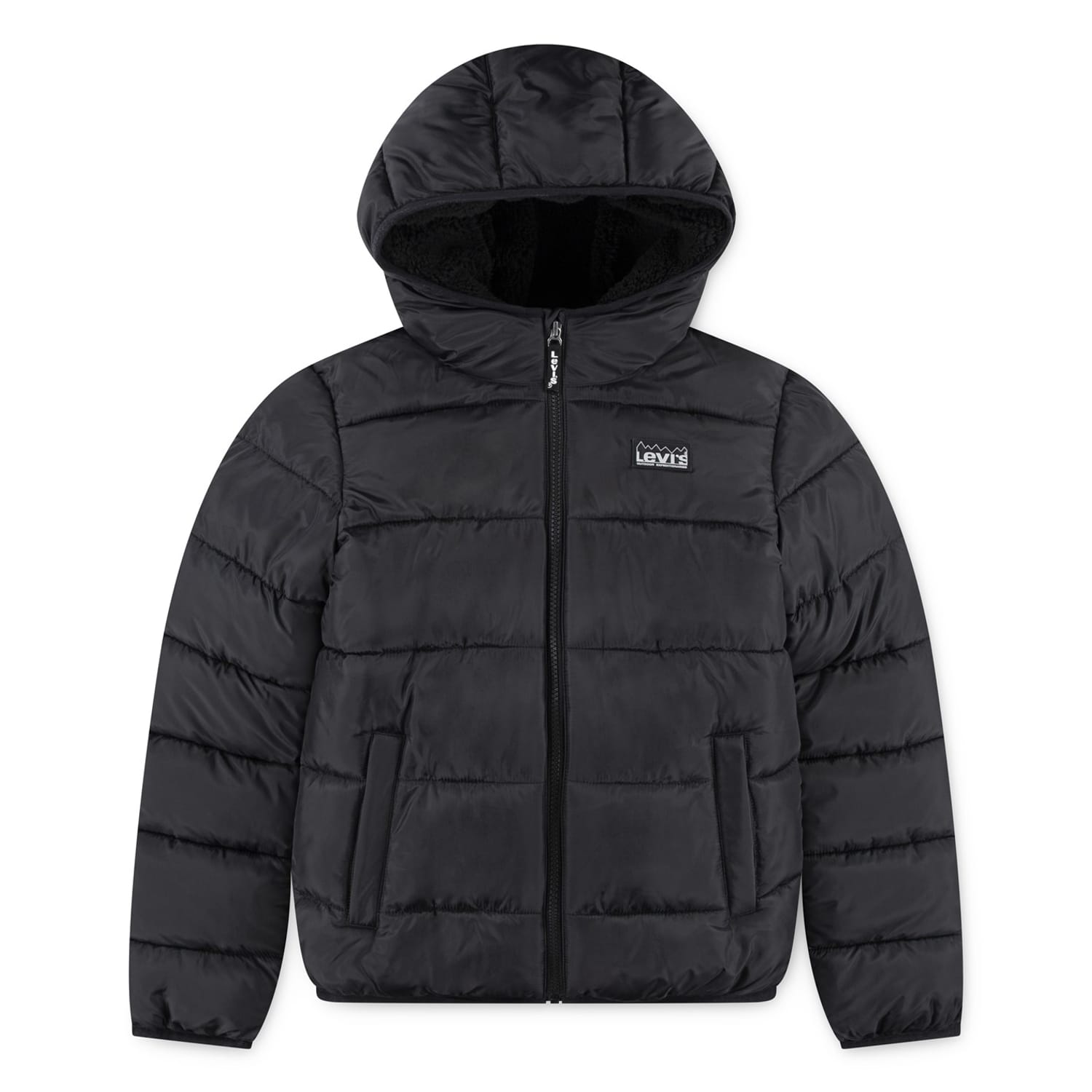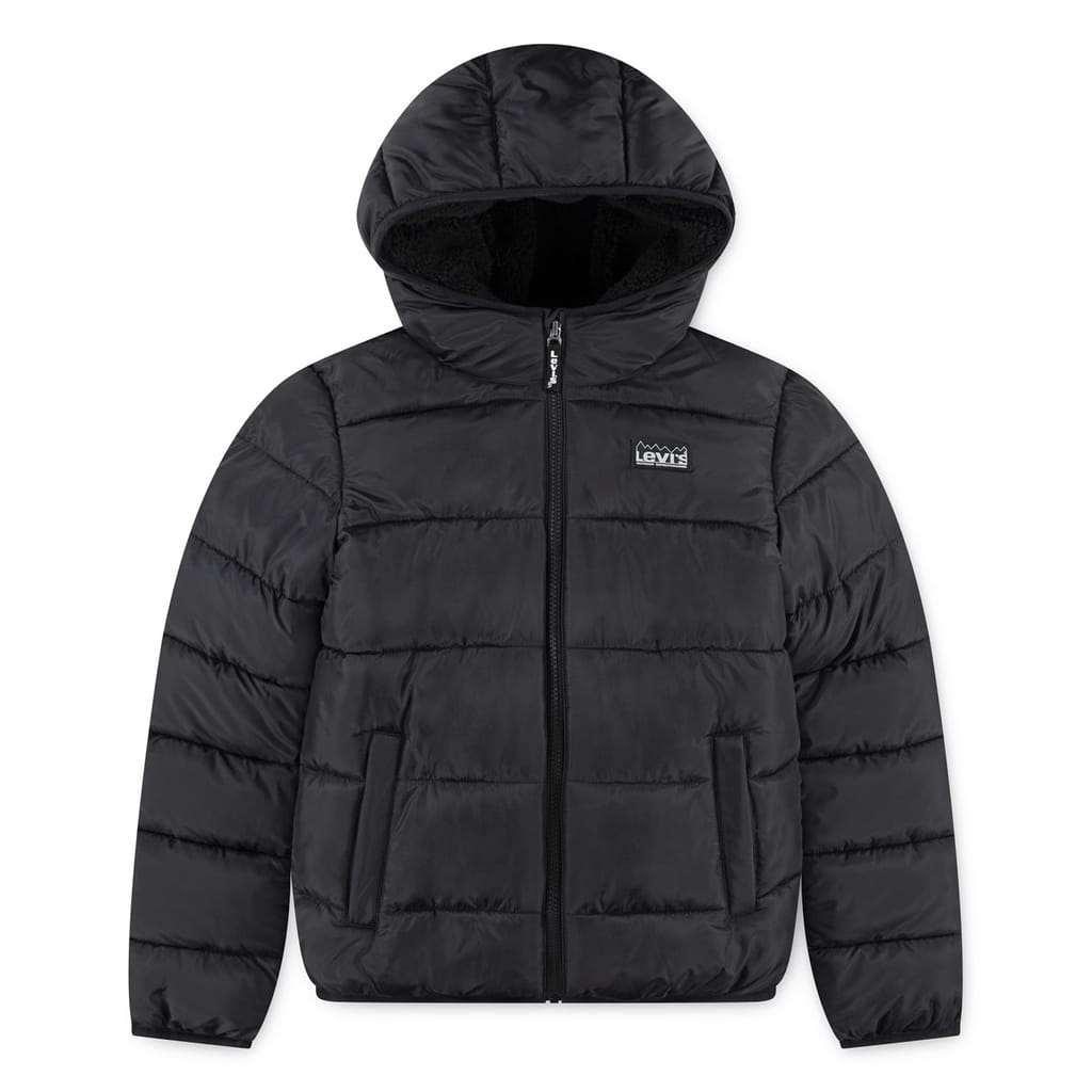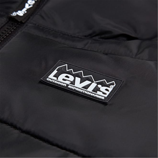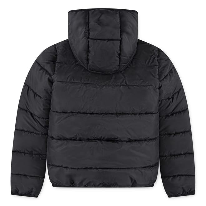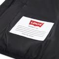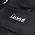 Levi's puffer jacket features a hooded neckline and a zipper closure, offering a regular fit. This short jacket is designed with a solid pattern and includes a logo embellishment, adding a touch of brand identity. -