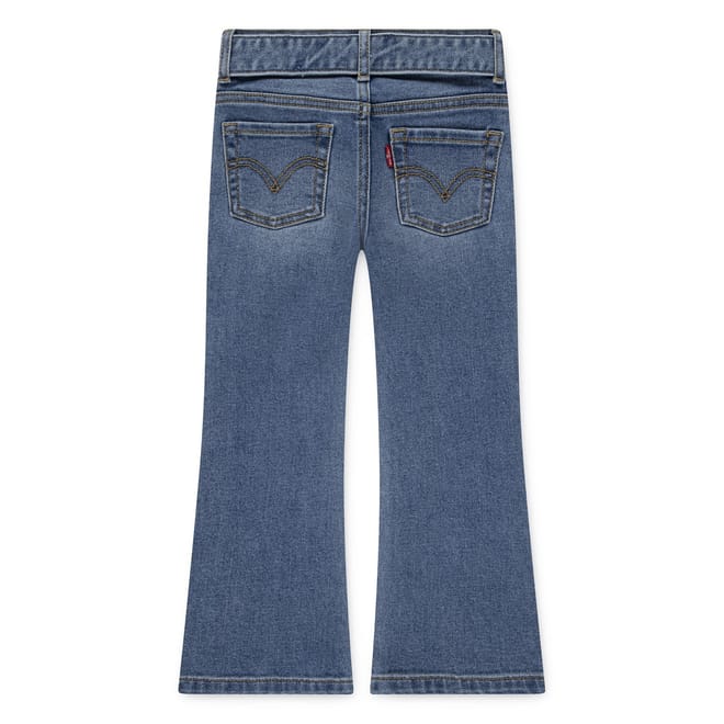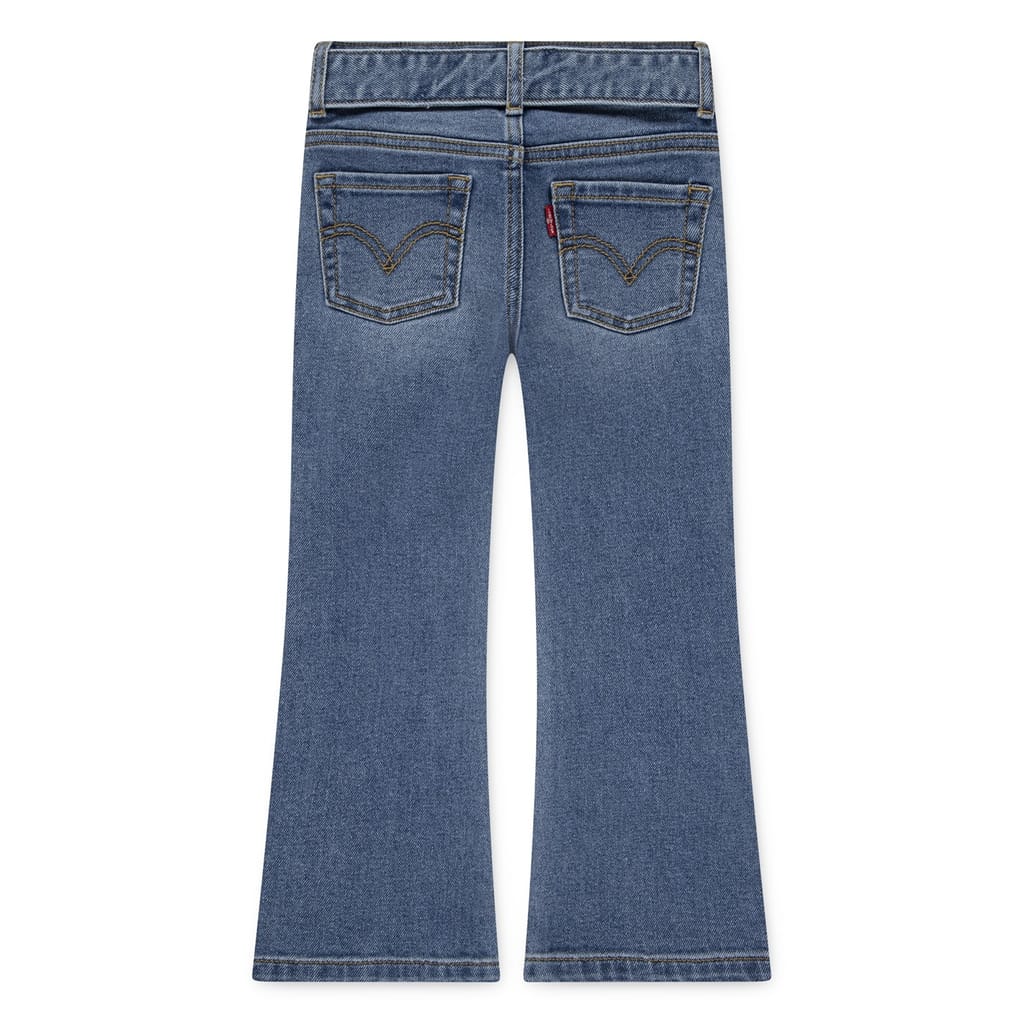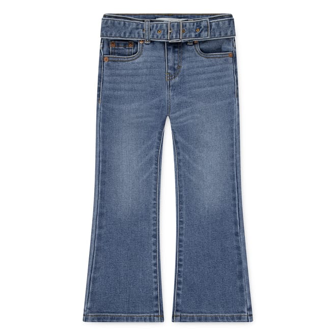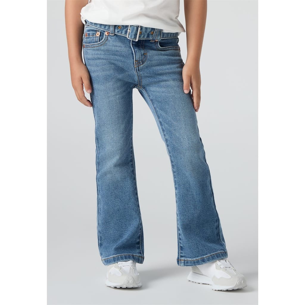 Levis jeans feature a regular fit with a flare leg cut, offering a classic five-pocket design. The jeans are crafted with a zip fly and button closure, complemented by a belt for added style. Embellished with contrast stitching, they include a coin pocket and two back pockets. The washed pattern adds a timeless touch to these versatile jeans. -