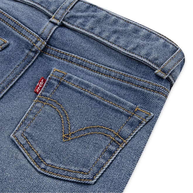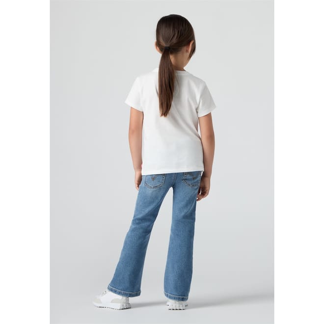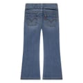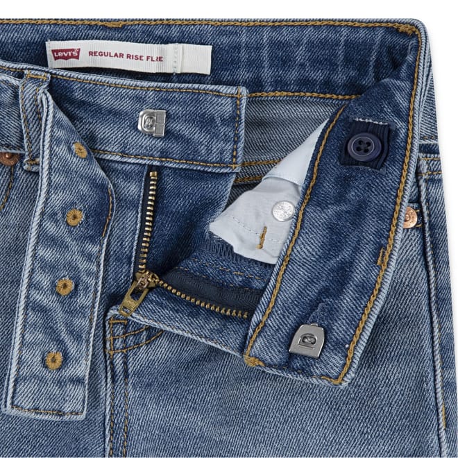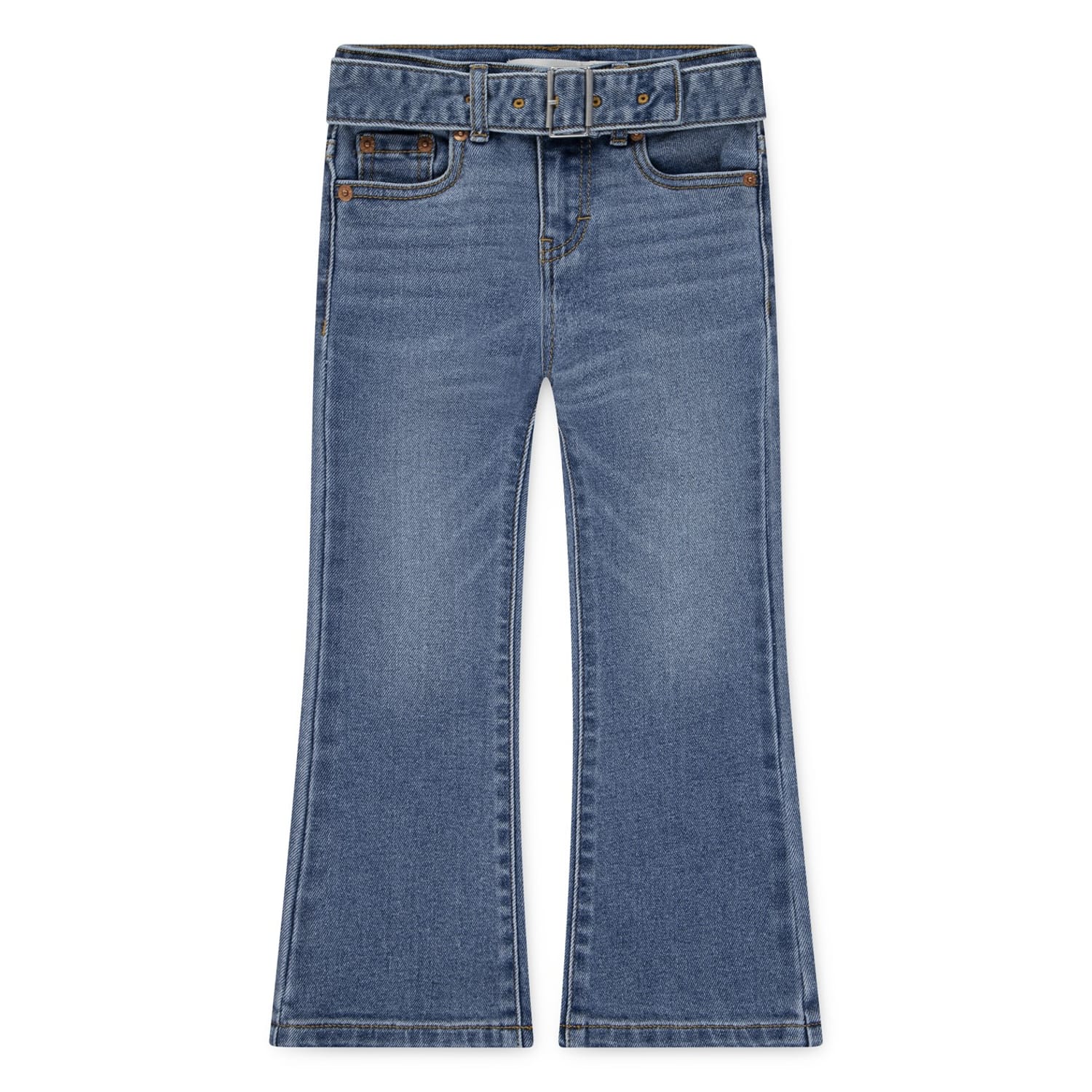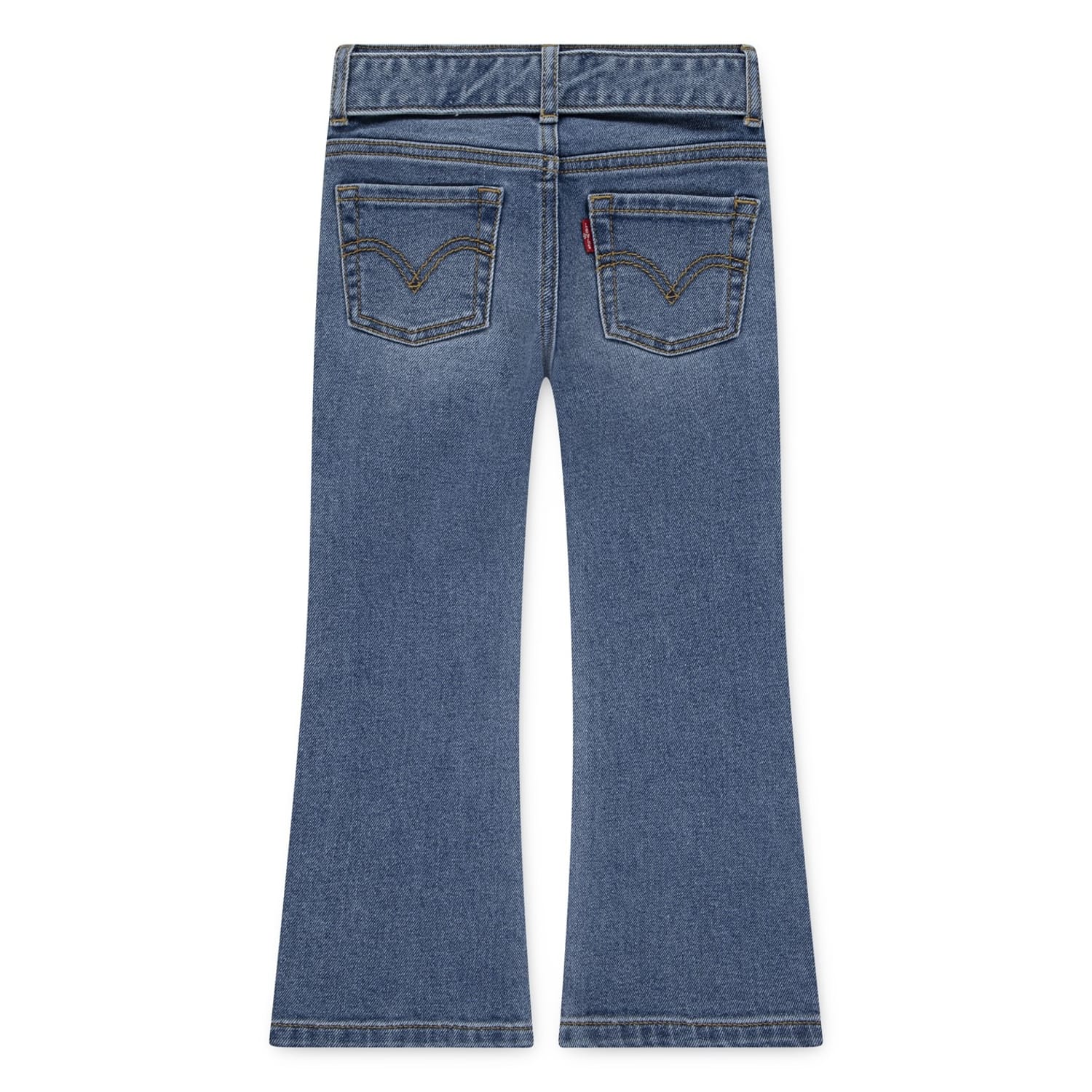 Levis jeans feature a regular fit with a flare leg cut, offering a classic five-pocket design. The jeans are crafted with a zip fly and button closure, complemented by a belt for added style. Embellished with contrast stitching, they include a coin pocket and two back pockets. The washed pattern adds a timeless touch to these versatile jeans. -