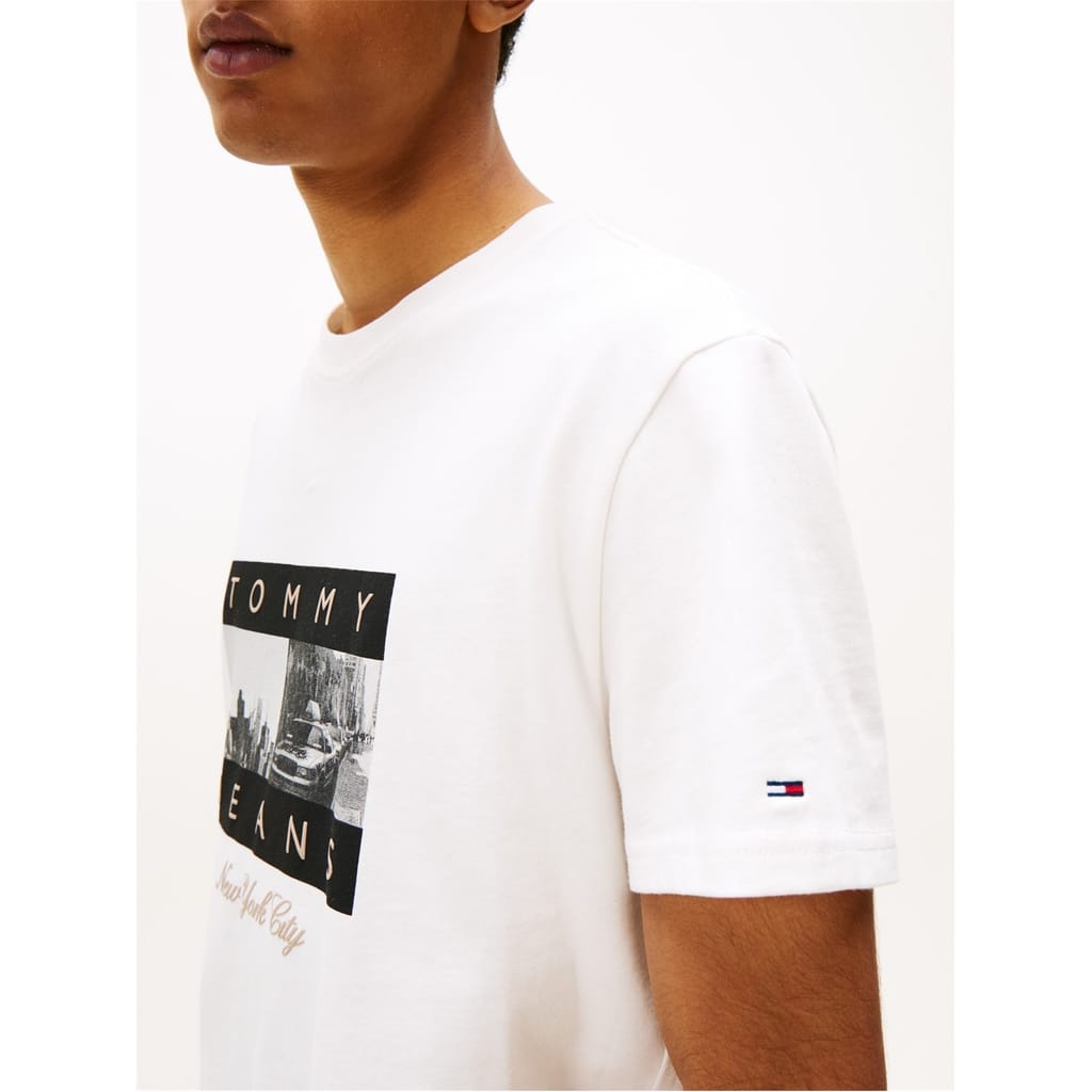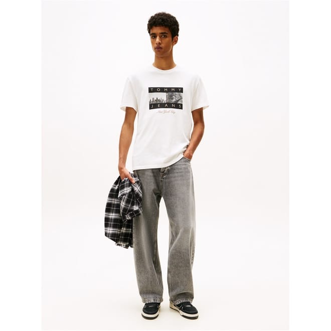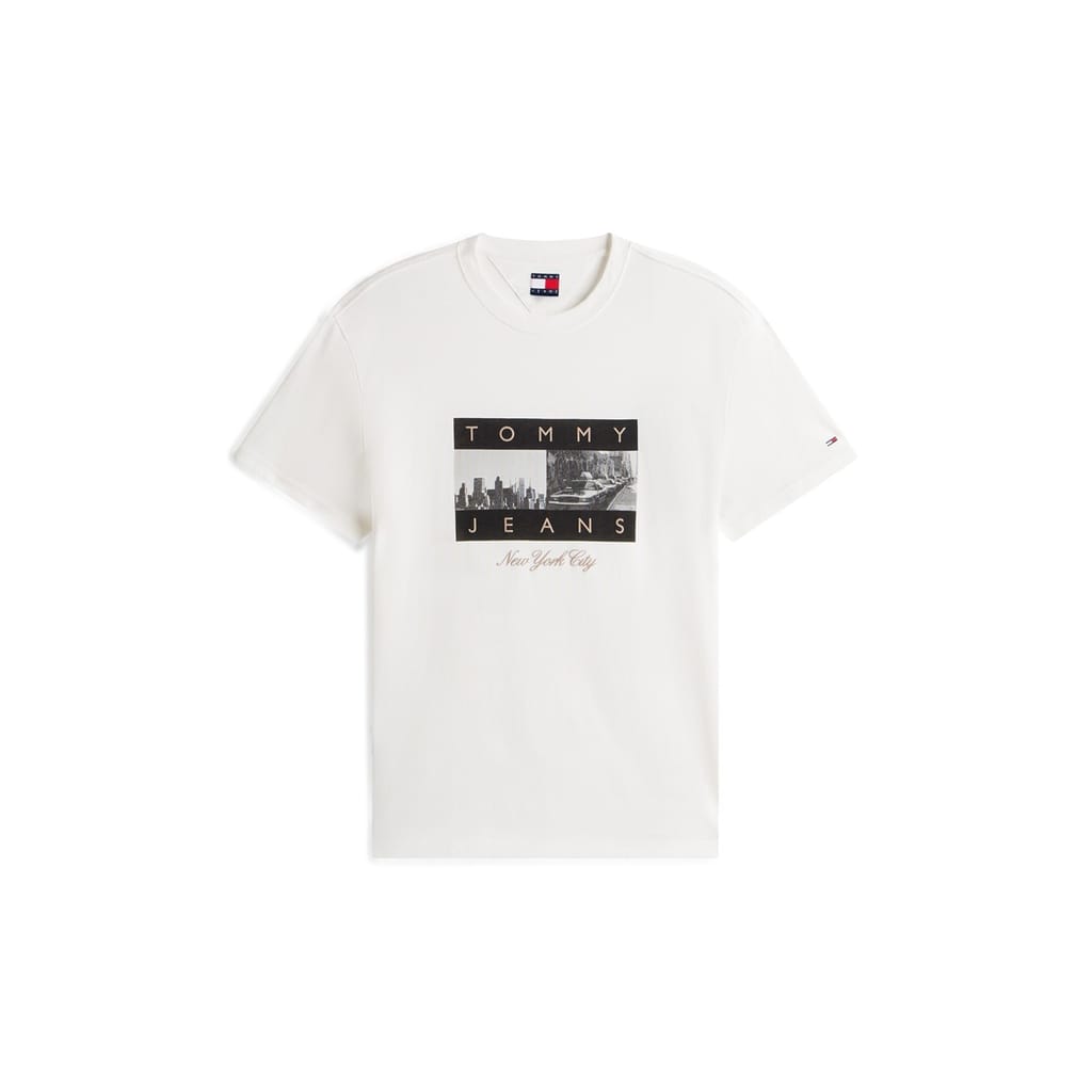 This Tommy Jeans top features a regular fit and a striking flag graphic, perfect for casual wear. The short sleeves and crew neck design offer a comfortable and stylish look. Ideal for those who appreciate a blend of fashion and comfort. -