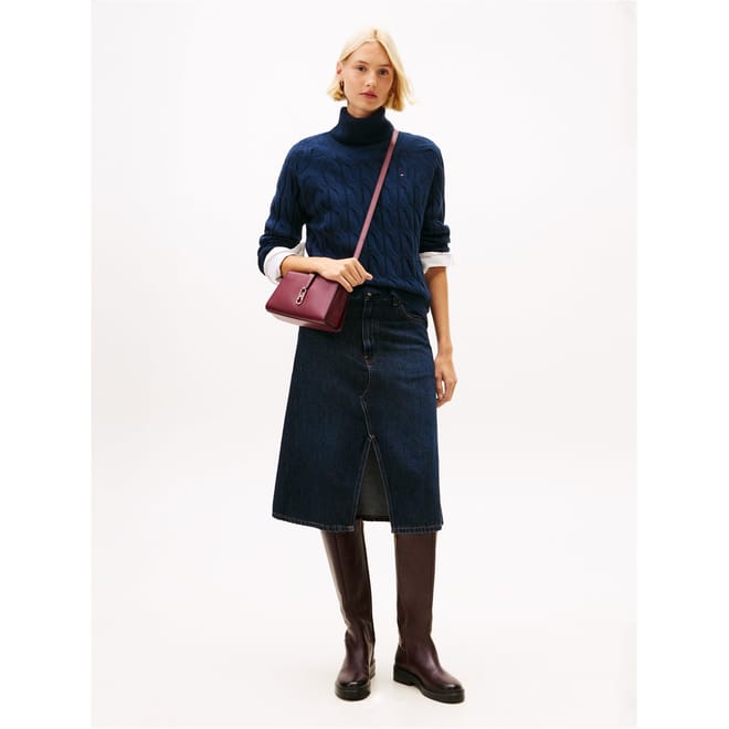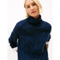 This Tommy Hilfiger top is a winter essential, featuring a cable knit pattern and a high collar. Designed with long sleeves and a rolled cuff, it offers a regular fit for comfort. The ribbed cuff adds a touch of detail, while the logo embellishment provides a subtle brand accent. Ideal for keeping warm, this top combines style and functionality effortlessly. -