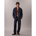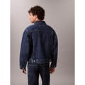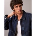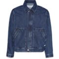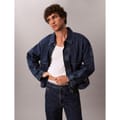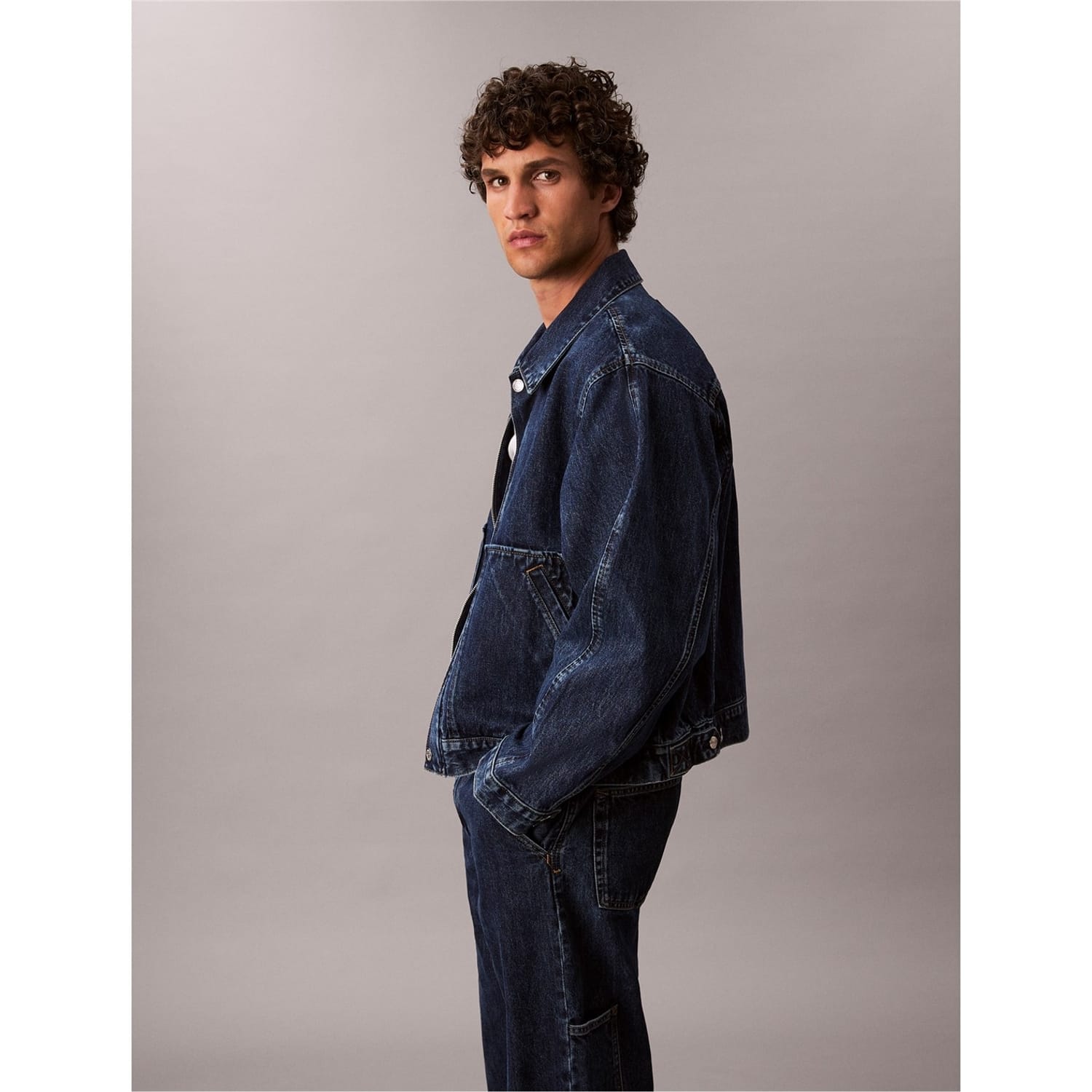 This Calvin Klein Jeans denim jacket features a classic shirt collar and a straight hem. Designed in a regular fit, it offers a solid pattern with a short length. The jacket is adorned with a logo and front pockets, providing both style and functionality. It includes a snap button closure for a secure fit. -
