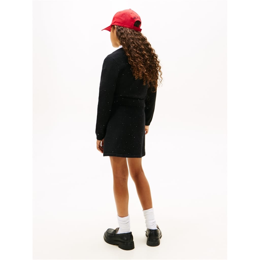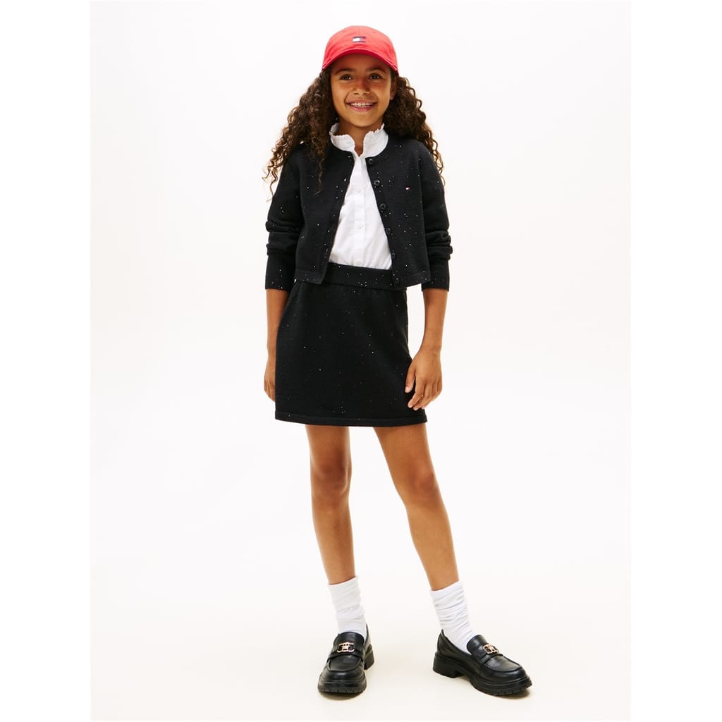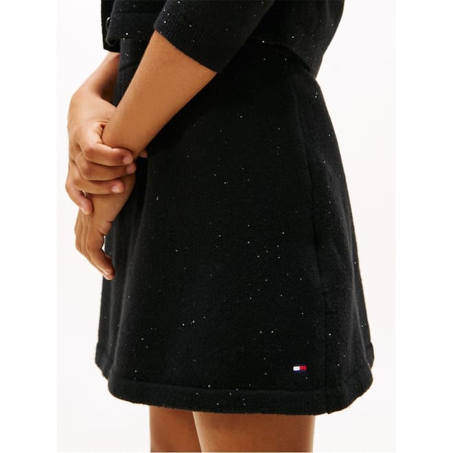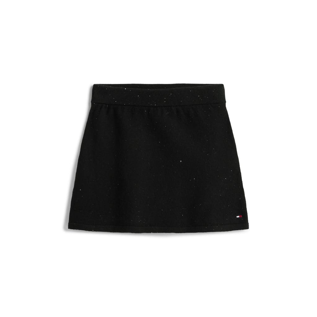 This Tommy Hilfiger mini skirt is a stylish addition to your casual collection. Crafted with a knit design, it features an elasticated waistband for a comfortable fit. The skirt is adorned with sequins and a logo embellishment, adding a touch of flair to its regular fit. Perfect for those seeking a chic and modern look. -