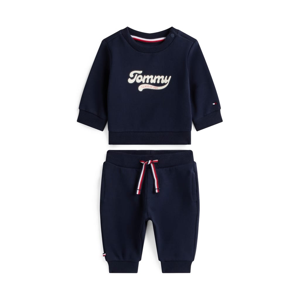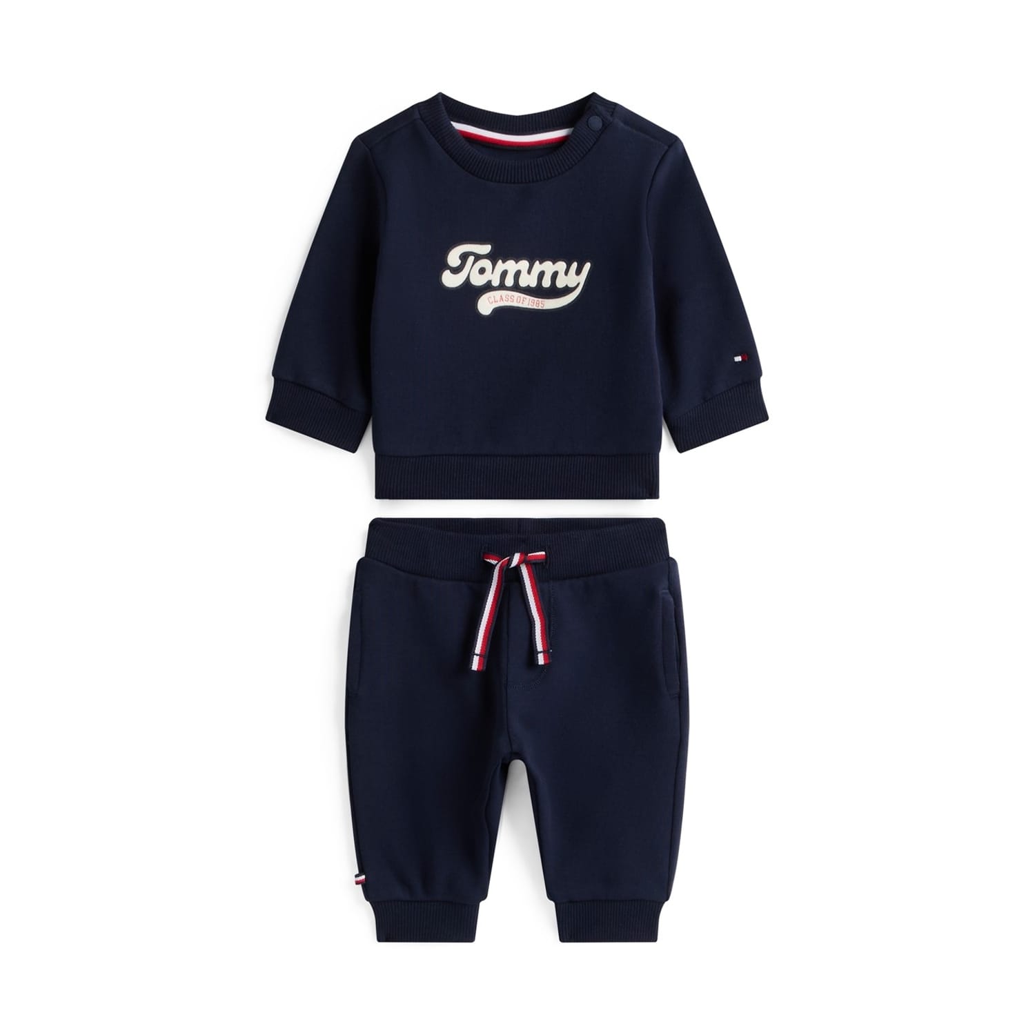 This Tommy Hilfiger coord set features a graphic sweatshirt with a crew neck and long plain sleeves, paired with casual joggers. The set is adorned with a logo embellishment, adding a stylish touch to the casual collection. Perfect for those who appreciate a blend of comfort and iconic design. -