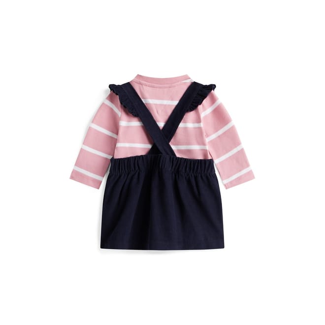 This Tommy Hilfiger pinafore dress features a classic crew neck and long sleeves, offering a timeless striped pattern. The set design adds a unique touch, making it a versatile addition to any wardrobe. -