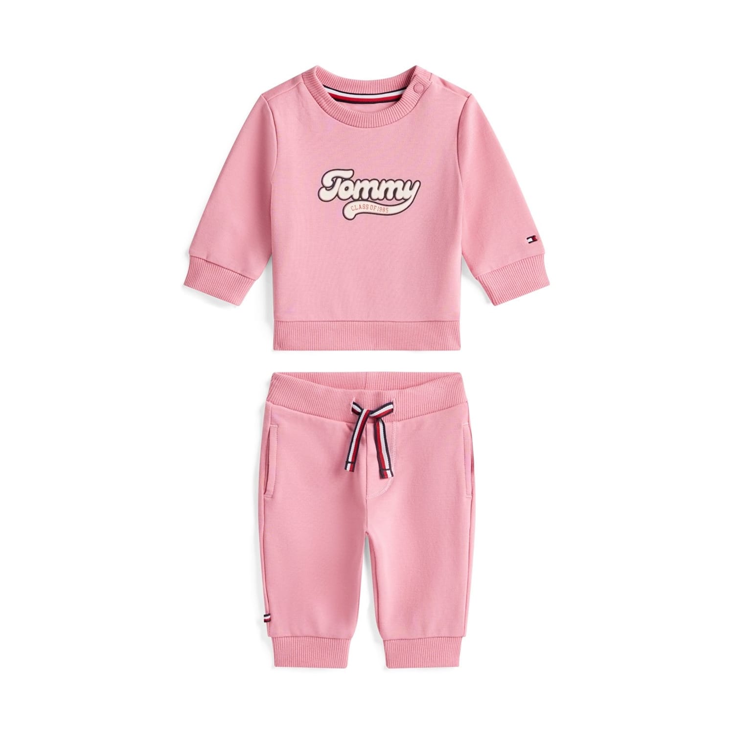 This Tommy Hilfiger coord set features a graphic print sweatshirt with a crew neck and long plain sleeves, complemented by casual jogger pants. The set is adorned with a logo and pockets, offering both style and functionality. Perfect for a casual look, this ensemble combines comfort with a touch of iconic branding. -