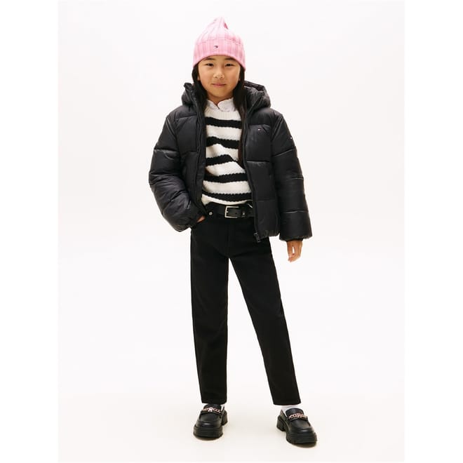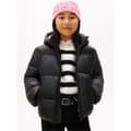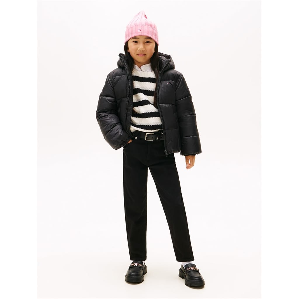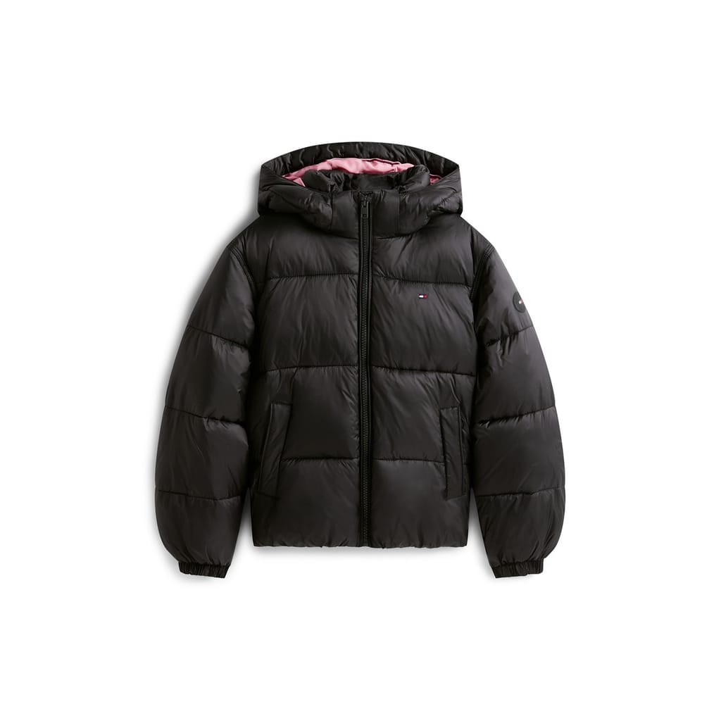 This Tommy Hilfiger puffer jacket features a hooded neckline and a regular fit, offering both style and comfort. The jacket is designed with a shining finish and a solid pattern, complemented by a straight hem and elasticated cuffs. It includes a front zipper closure and practical pockets, adorned with the brand's logo for a distinctive touch. -
