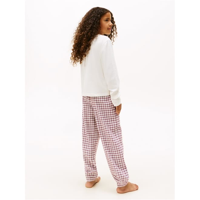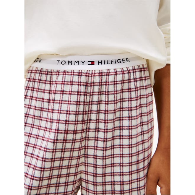 Discover the Tommy Hilfiger sleepwear set, featuring a plaid pattern and regular fit. This two-piece pyjama set includes cuffed pajama pants with an elasticated waistband for comfort. The ensemble is adorned with a logo on the waistband and left chest, adding a touch of brand identity to your nightwear collection. -