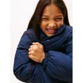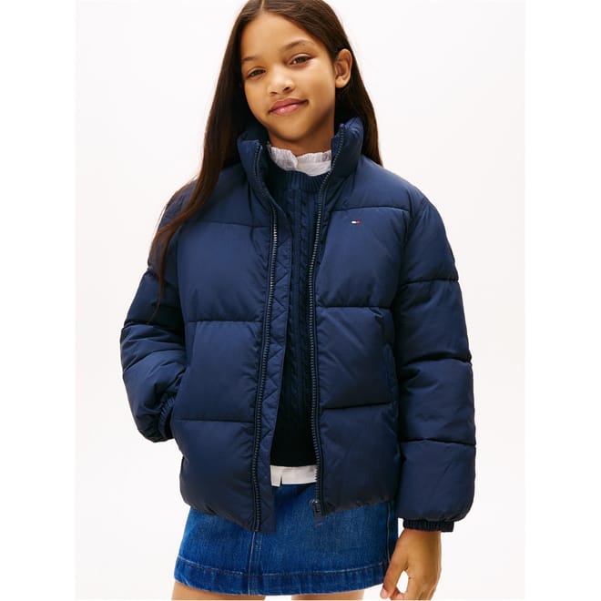 This Tommy Hilfiger puffer jacket features a solid pattern with a regular fit, offering both style and comfort. The jacket is adorned with a flag graphic and logo embellishments, adding a distinctive touch. It includes a zipper closure and elasticated cuffs for a secure fit. The straight hem and short length complete the design, making it a versatile addition to your wardrobe. -