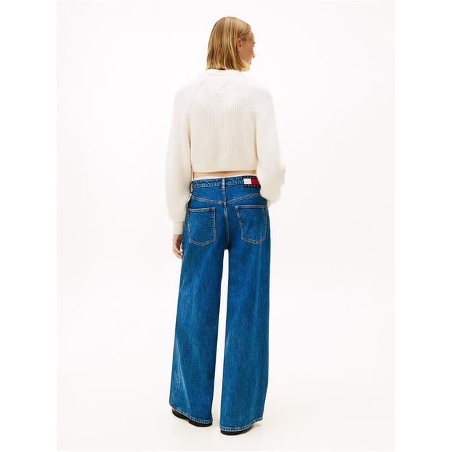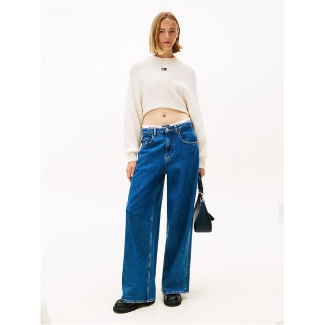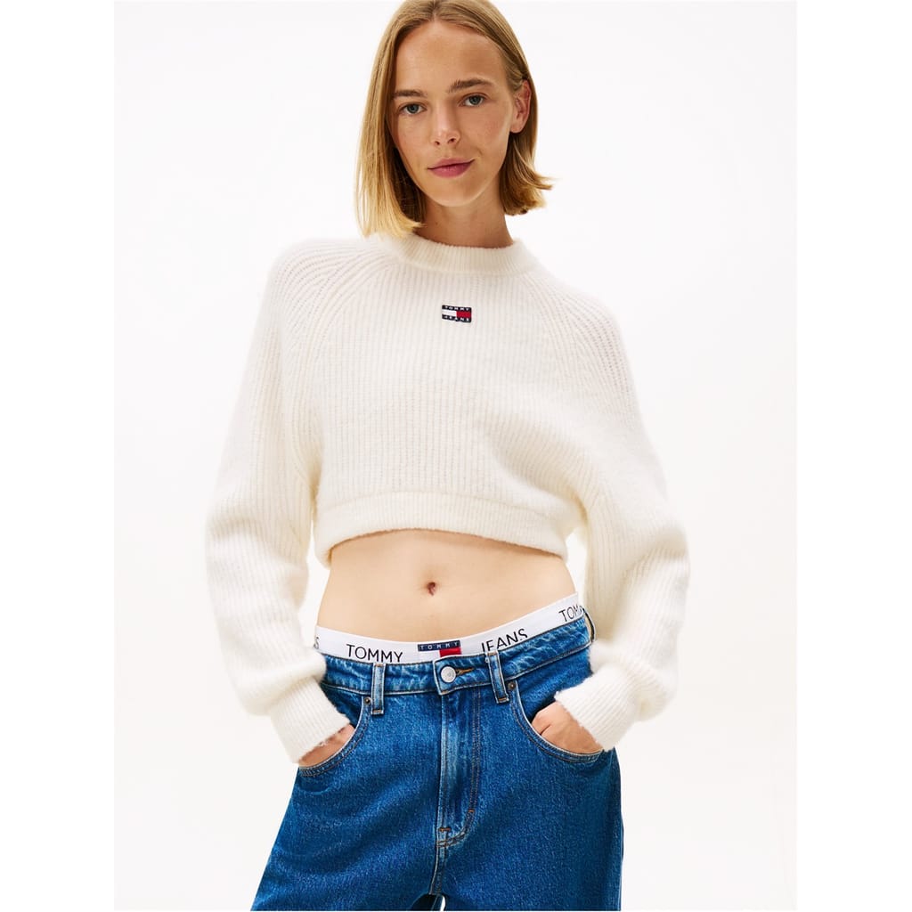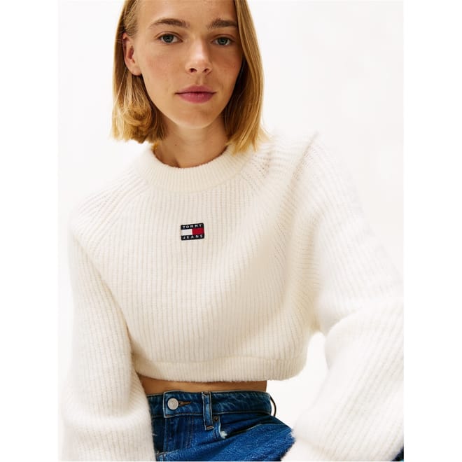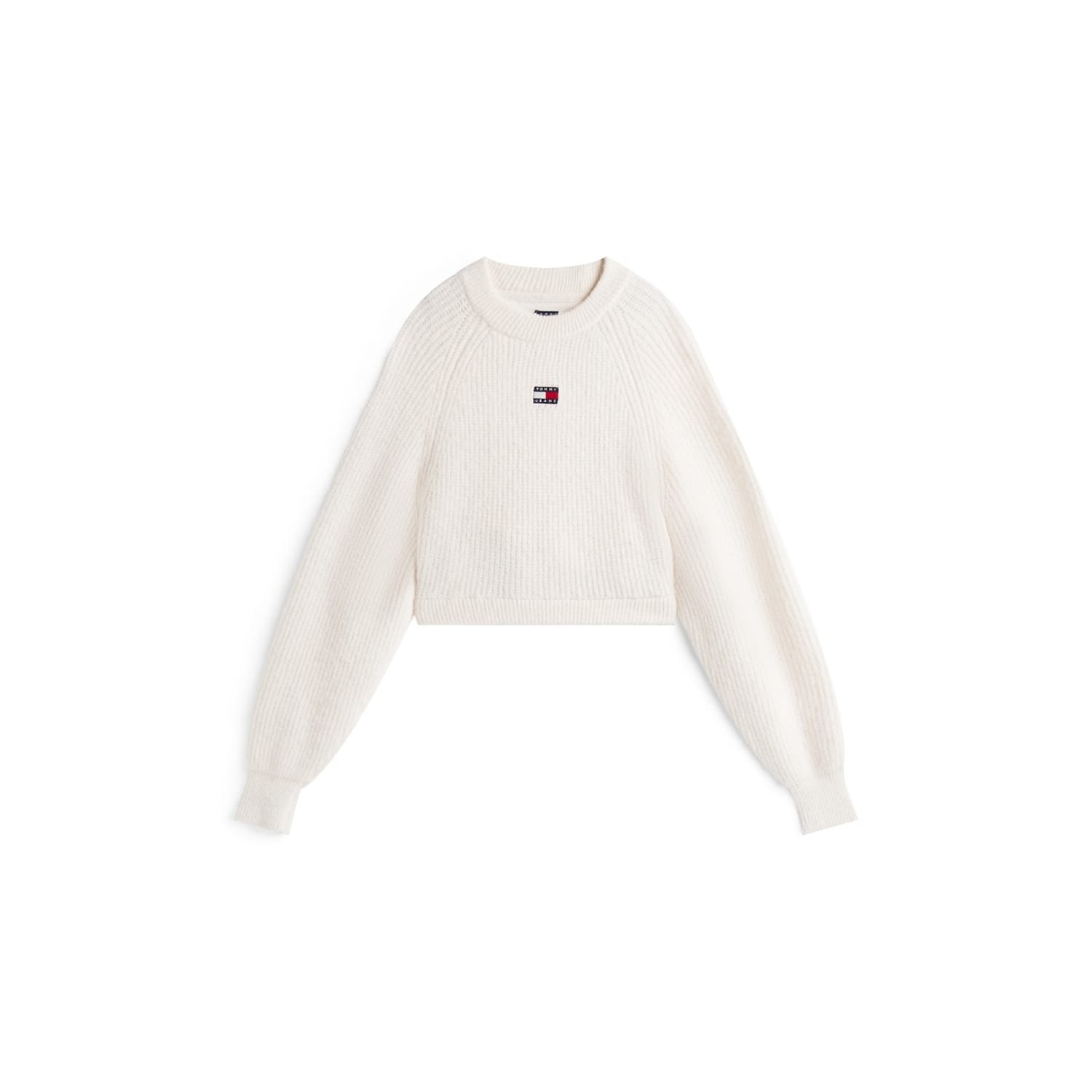 This Tommy Jeans top features a cropped design with a crew neck and raglan long sleeves. The boxy fit is complemented by ribbed cuffs and a ribbed collar, while a banded hem adds a touch of style. The knit fabric is adorned with a badge embellishment, offering a unique look. The ribbed pattern enhances the overall texture, making it a standout piece in any wardrobe. -