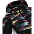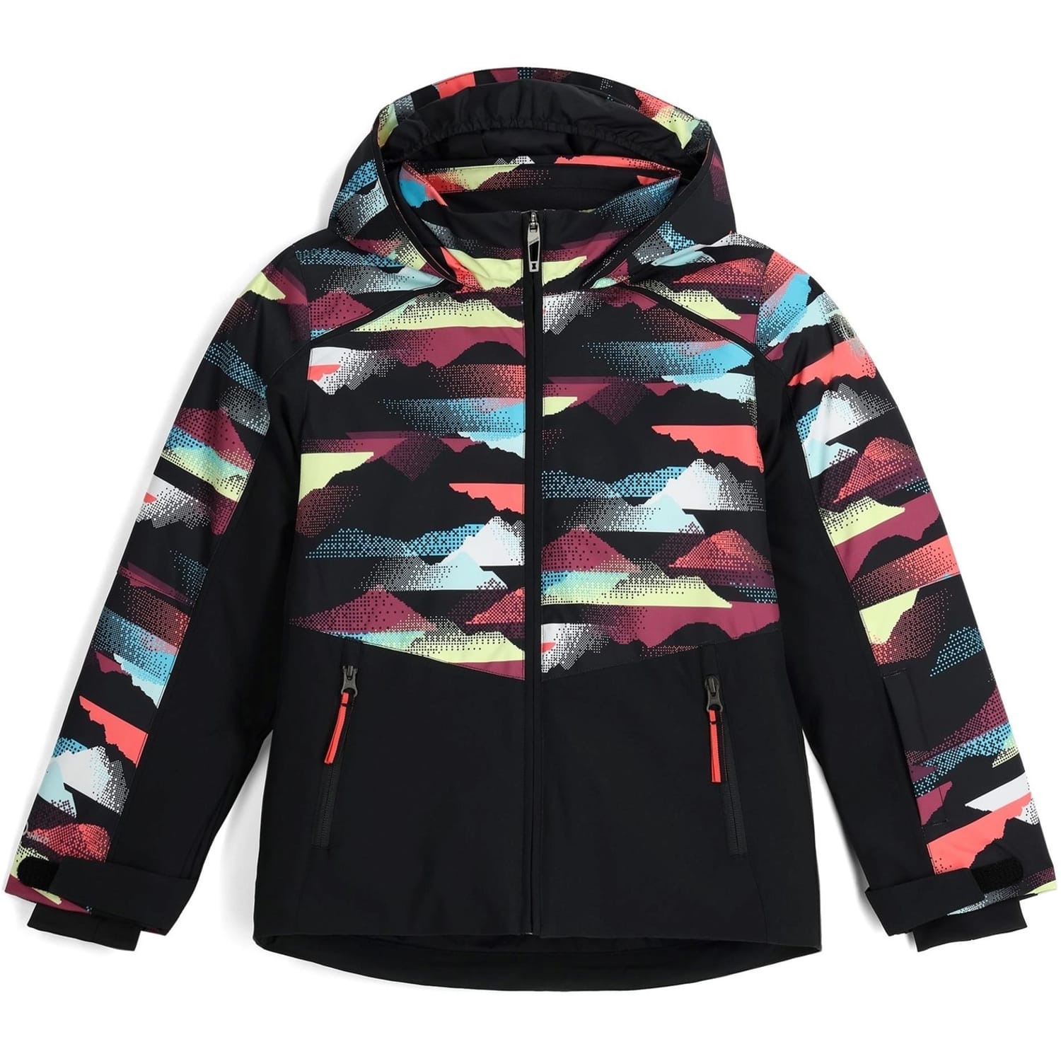 This Spyder ski jacket features a hooded neckline and a zipper closure, offering a regular fit. The jacket is adorned with a graphic print, adding a stylish touch to its functional design. -