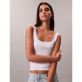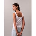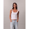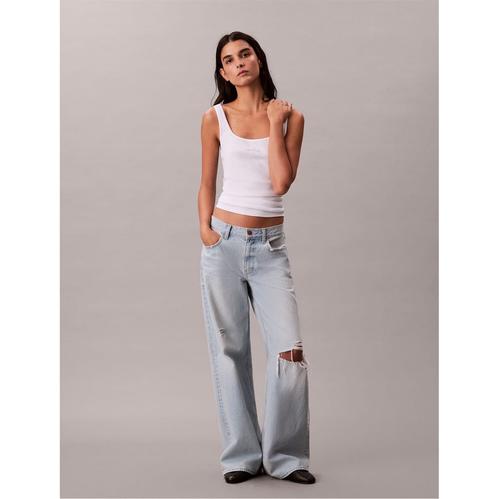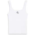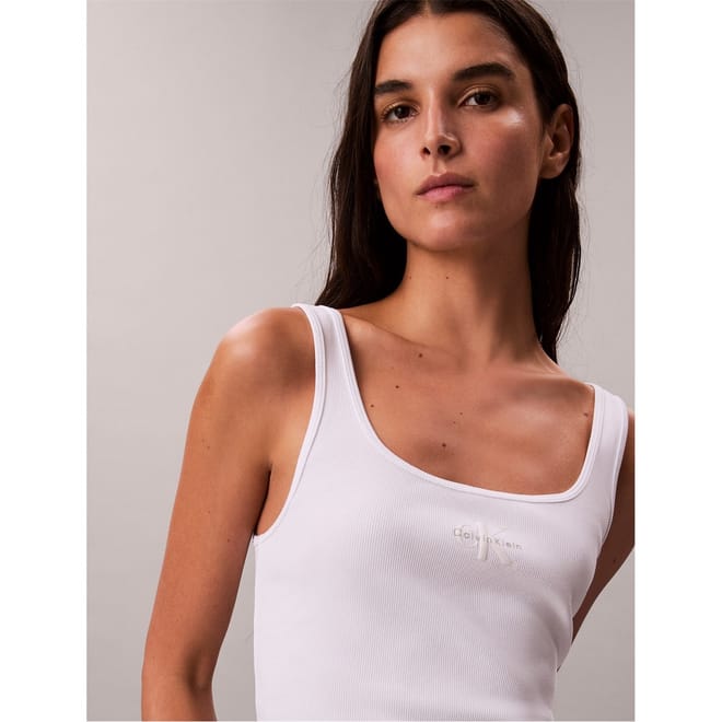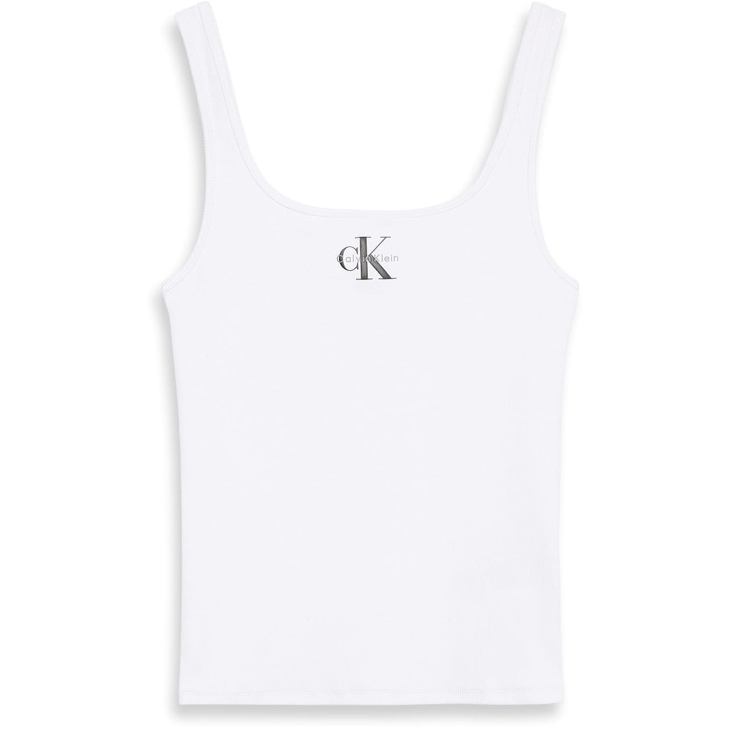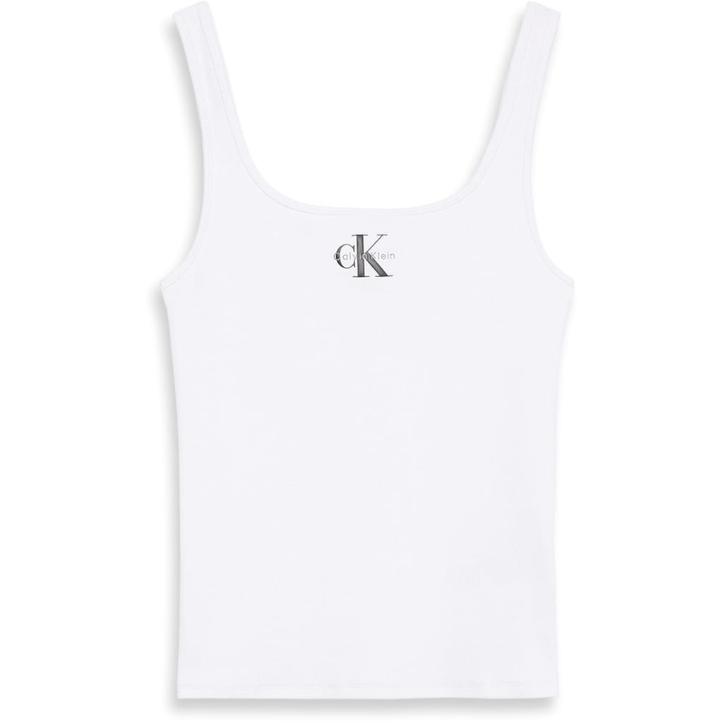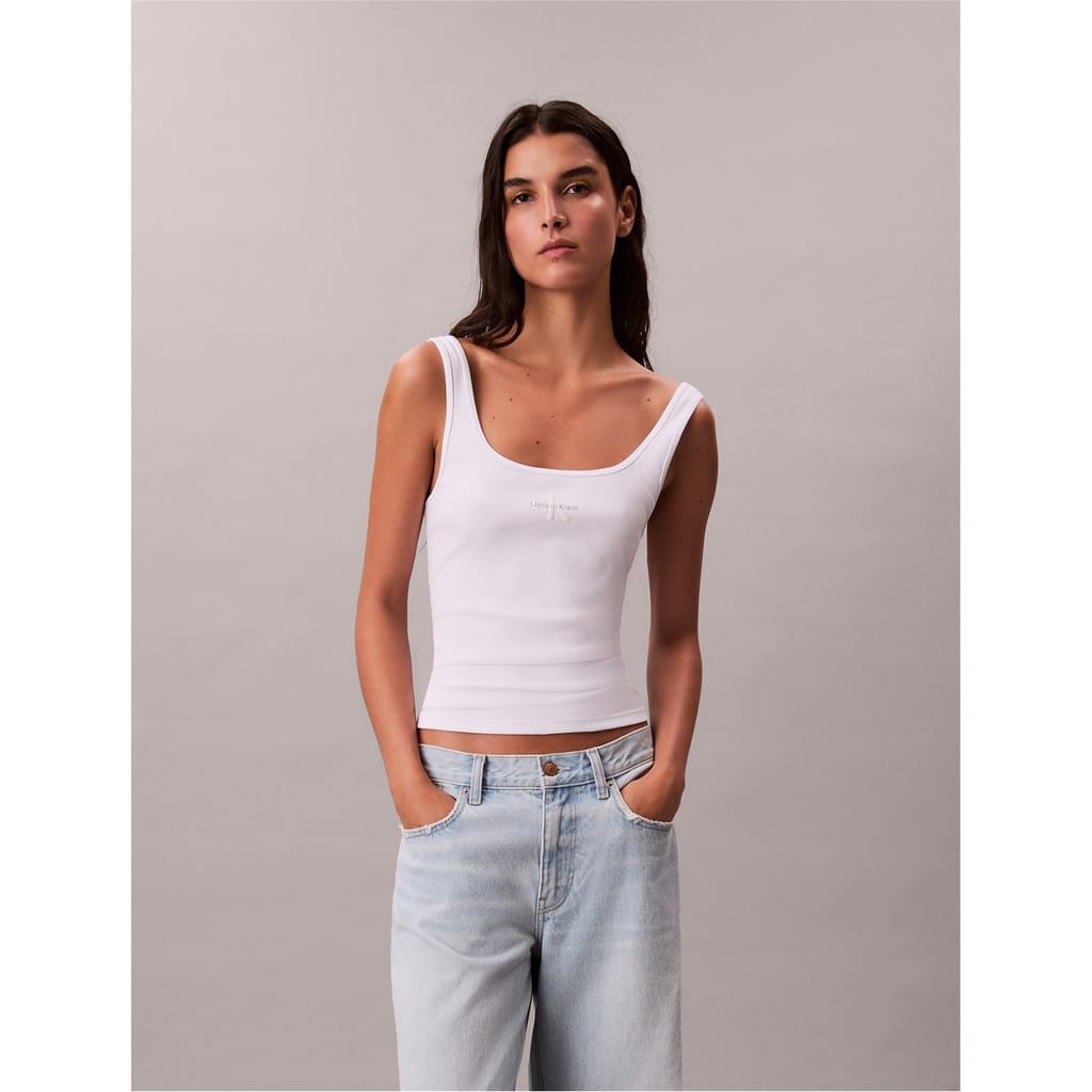 This Calvin Klein Jeans top features a sleek sleeveless design with a slim fit, perfect for a modern look. The solid pattern and straight hem add to its minimalist appeal. A subtle logo embellishment completes the design, making it a stylish choice for any wardrobe. -