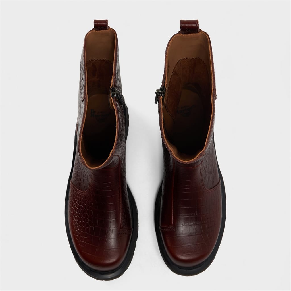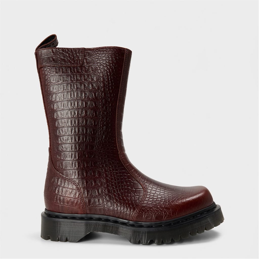 Discover the iconic Dr. Martens knee-high boots, a standout addition to any footwear collection. These boots feature a distinctive snake skin texture, adding a unique flair to their design. Crafted with a round toe, they offer both style and comfort. Perfect for those seeking a bold yet classic look, these boots embody the timeless appeal of Dr. Martens. -