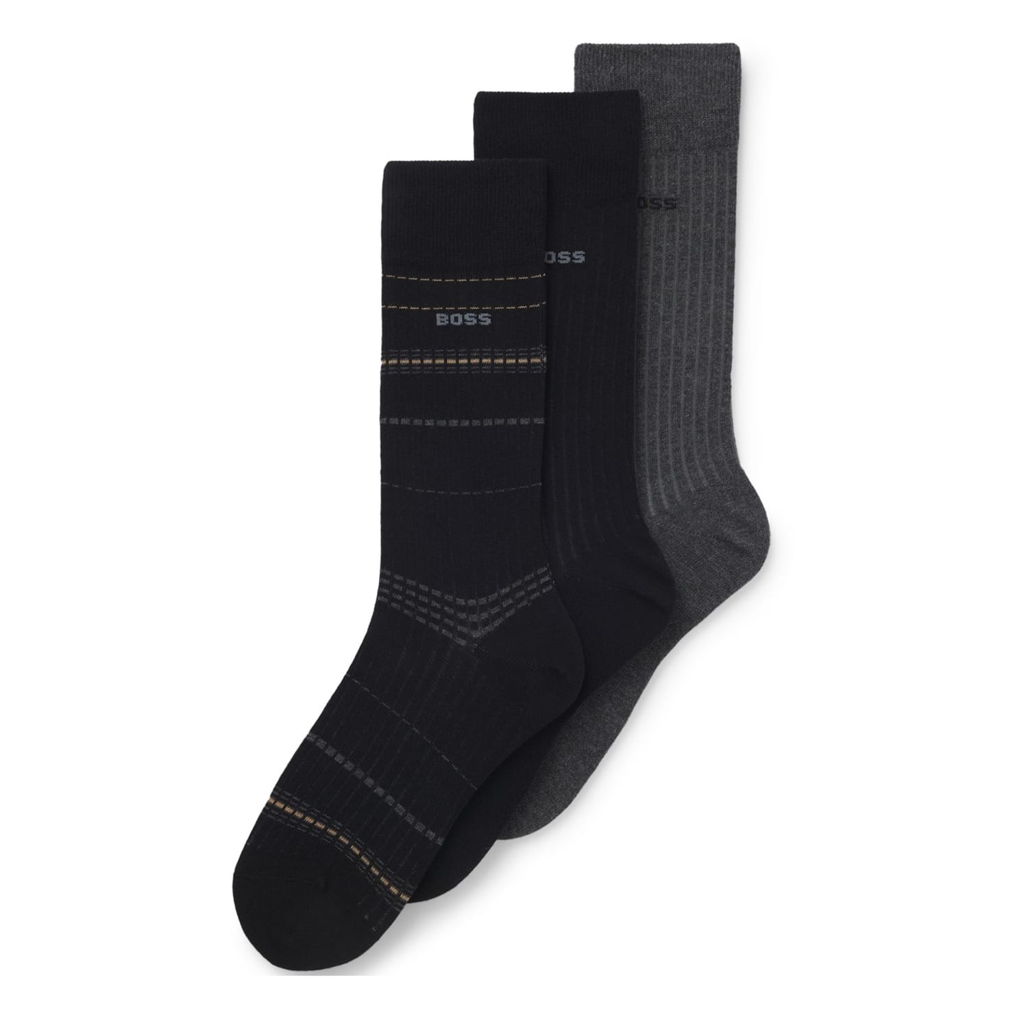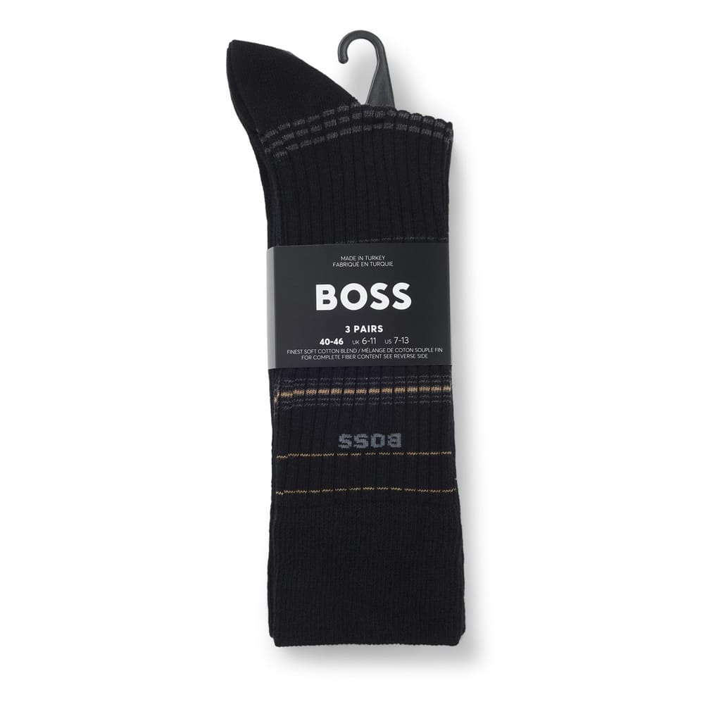 The BOSS 3 Pack Rib Stripe Socks brings everyday comfort with a touch of style. Featuring ribbed structures with logos and striped details, each pair is cut to a regular length for a classic fit. Perfect for daily wear, whether at work or on the weekend.