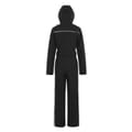 Nevica presents a stylish skisuit jumpsuit featuring a hooded neck and long plain sleeves. This regular fit design includes a front zipper and buckle closure for secure wear. The jumpsuit is adorned with a shield embellishment and practical zipped pockets. Its striking stripe and color block pattern adds a modern touch, making it a functional and fashionable choice. -