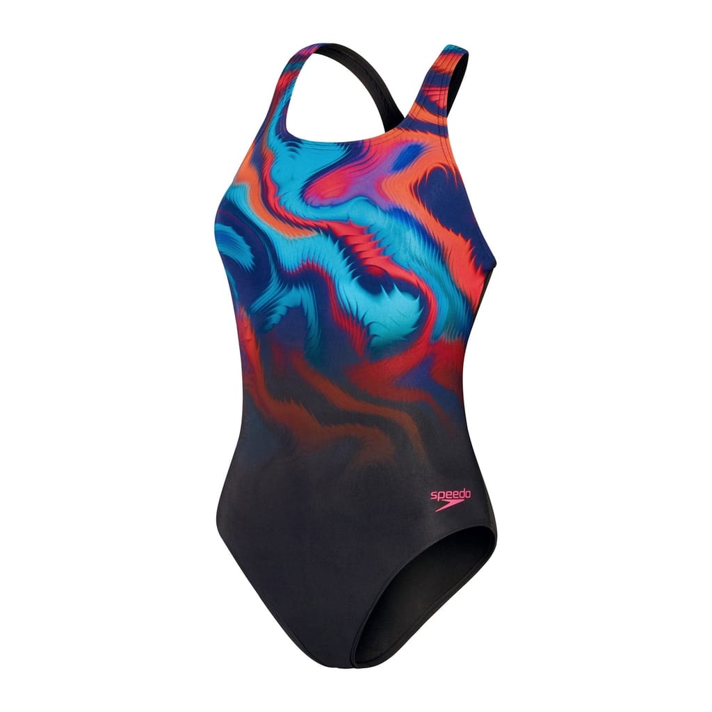 Dive into style with Speedo's one-piece swimwear, featuring an eye-catching abstract pattern. This swimwear is designed for those who appreciate both functionality and fashion. The iconic logo embellishment adds a touch of brand recognition, making it a standout choice for your swimwear collection. -
