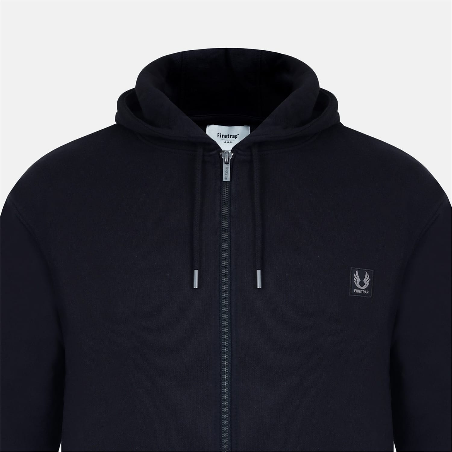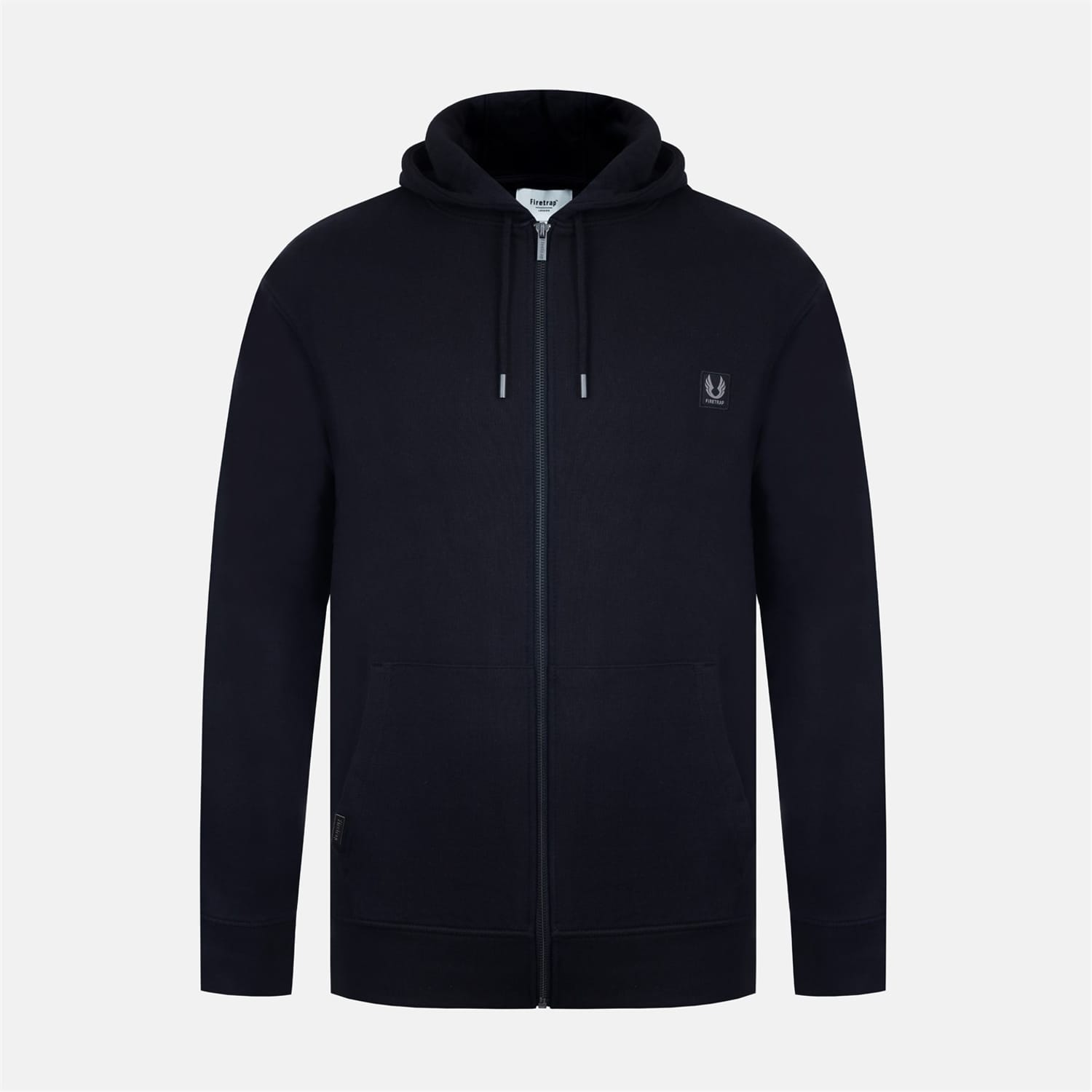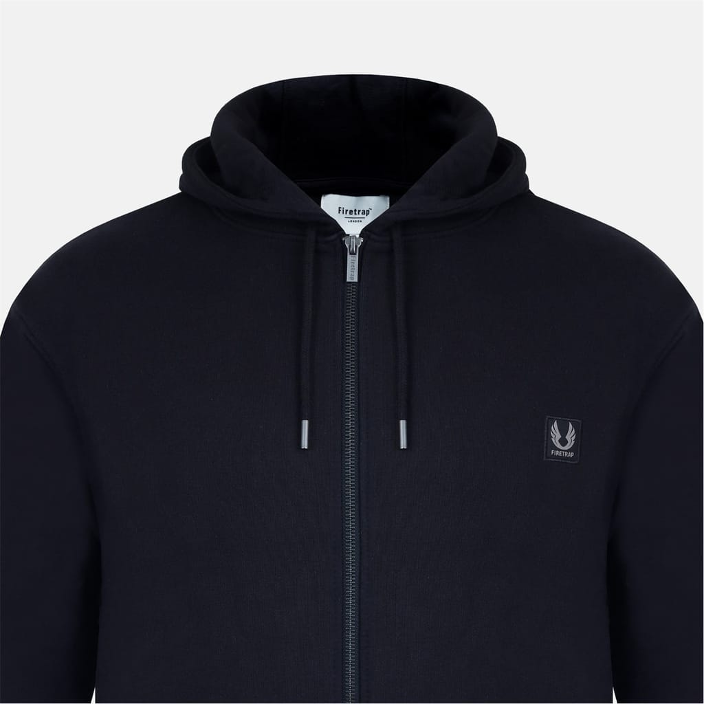 This Firetrap sweatshirt jacket features a hooded design with a zipper closure, offering a practical and stylish option for cooler days. The regular fit ensures comfort, while the ribbed cuffs and hem provide a snug finish. Embellished with a logo patch and pockets, this solid-patterned jacket combines functionality with a sleek look. -
