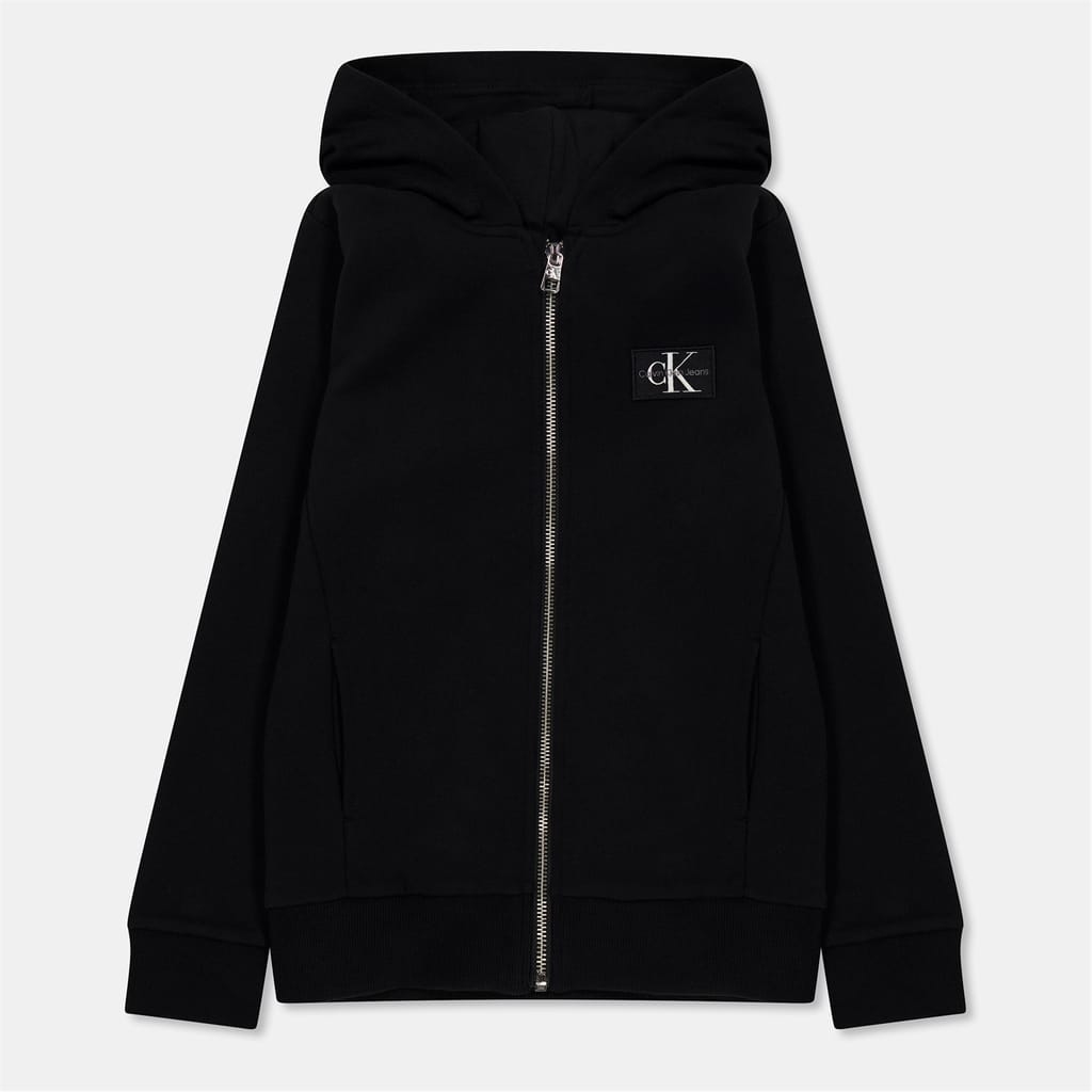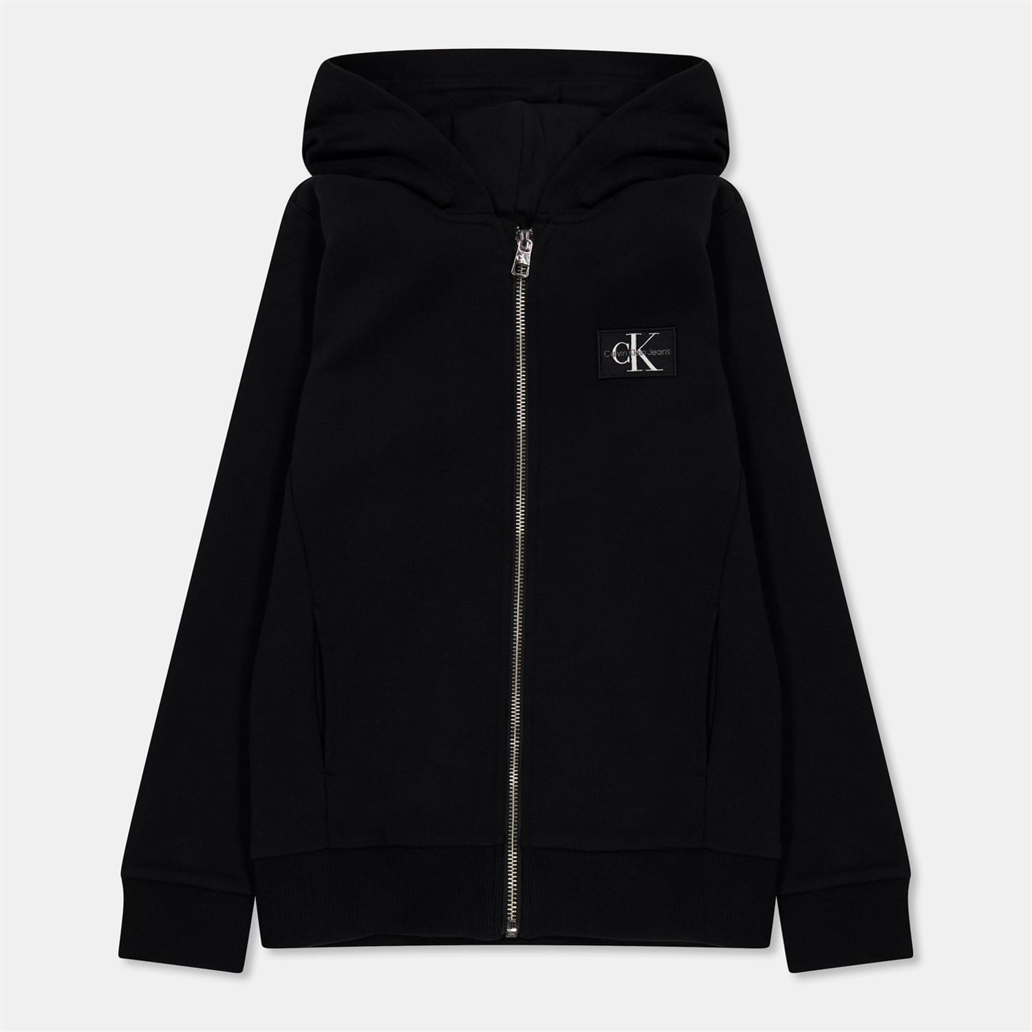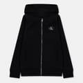 This Calvin Klein Jeans sweatshirt jacket features a hooded neckline and a convenient zipper closure. Designed with a regular fit, it offers a straight hem and showcases a solid pattern. The jacket is embellished with a logo, adding a touch of brand identity. -