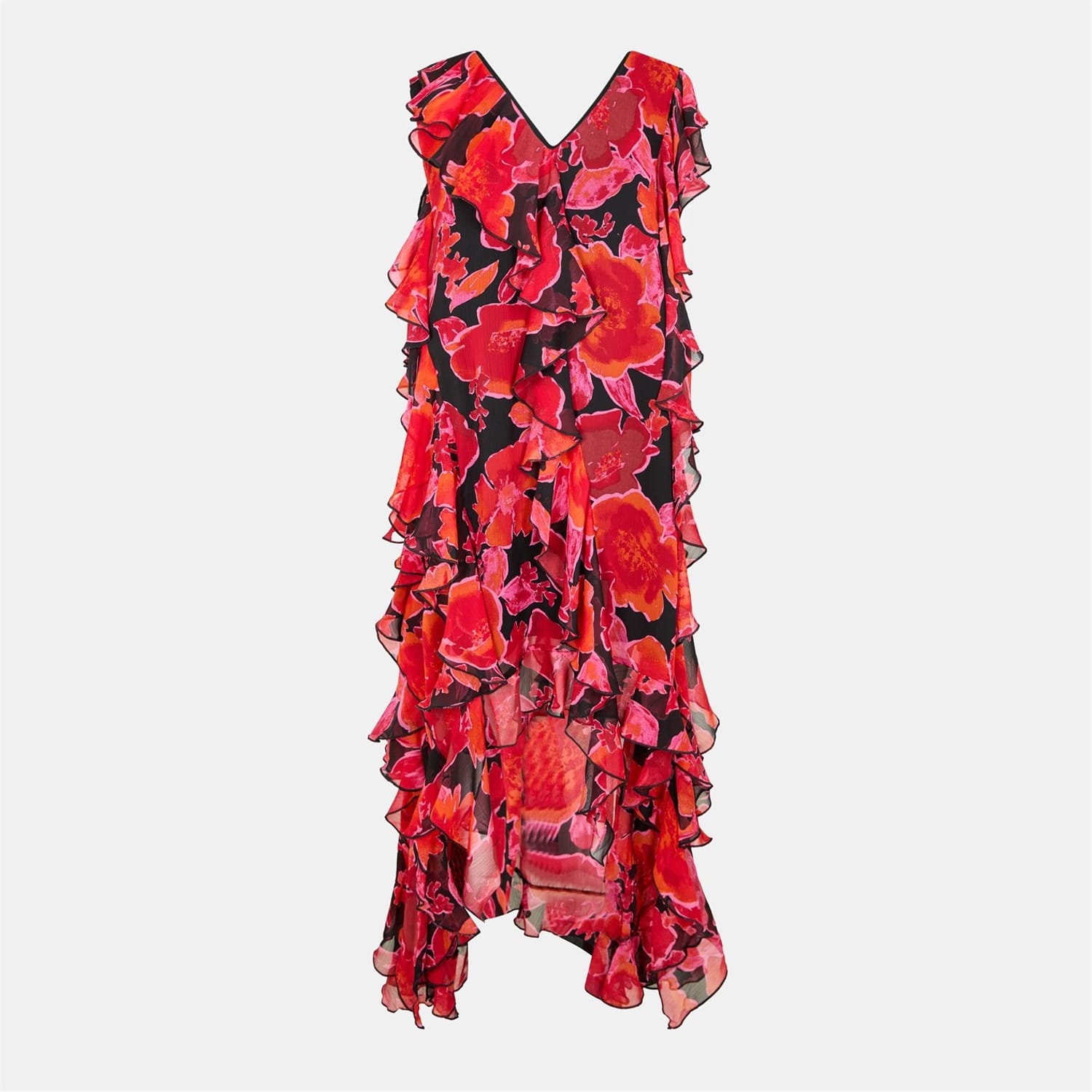 This Biba slip dress features a charming floral pattern, perfect for adding a touch of elegance to your wardrobe. The midi length and ruffle embellishments create a graceful silhouette, while the V-neckline adds a hint of sophistication. The dress is completed with a ruffle hem, enhancing its feminine appeal. -