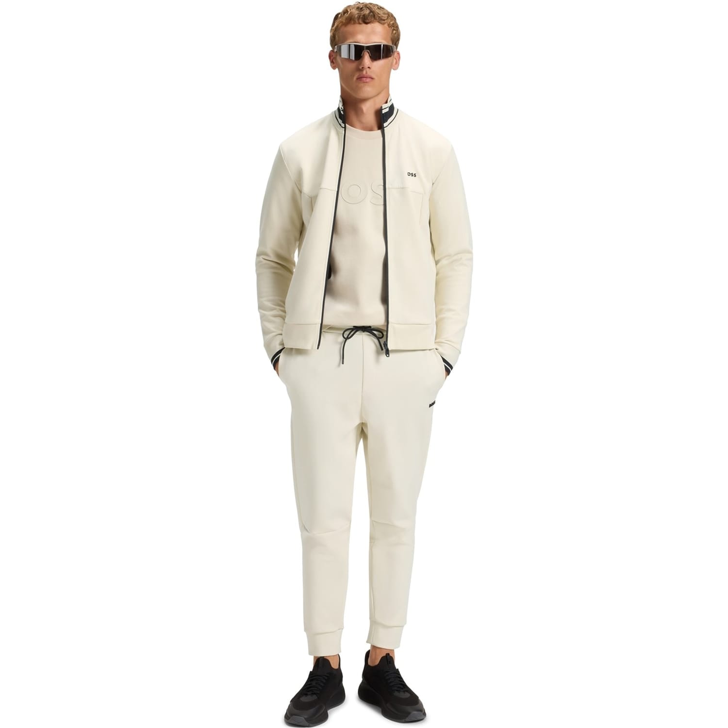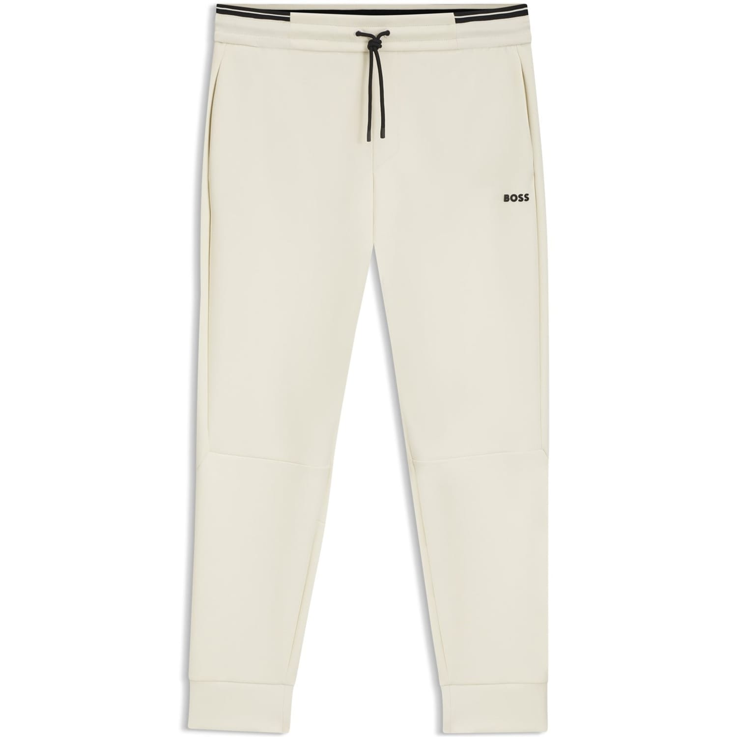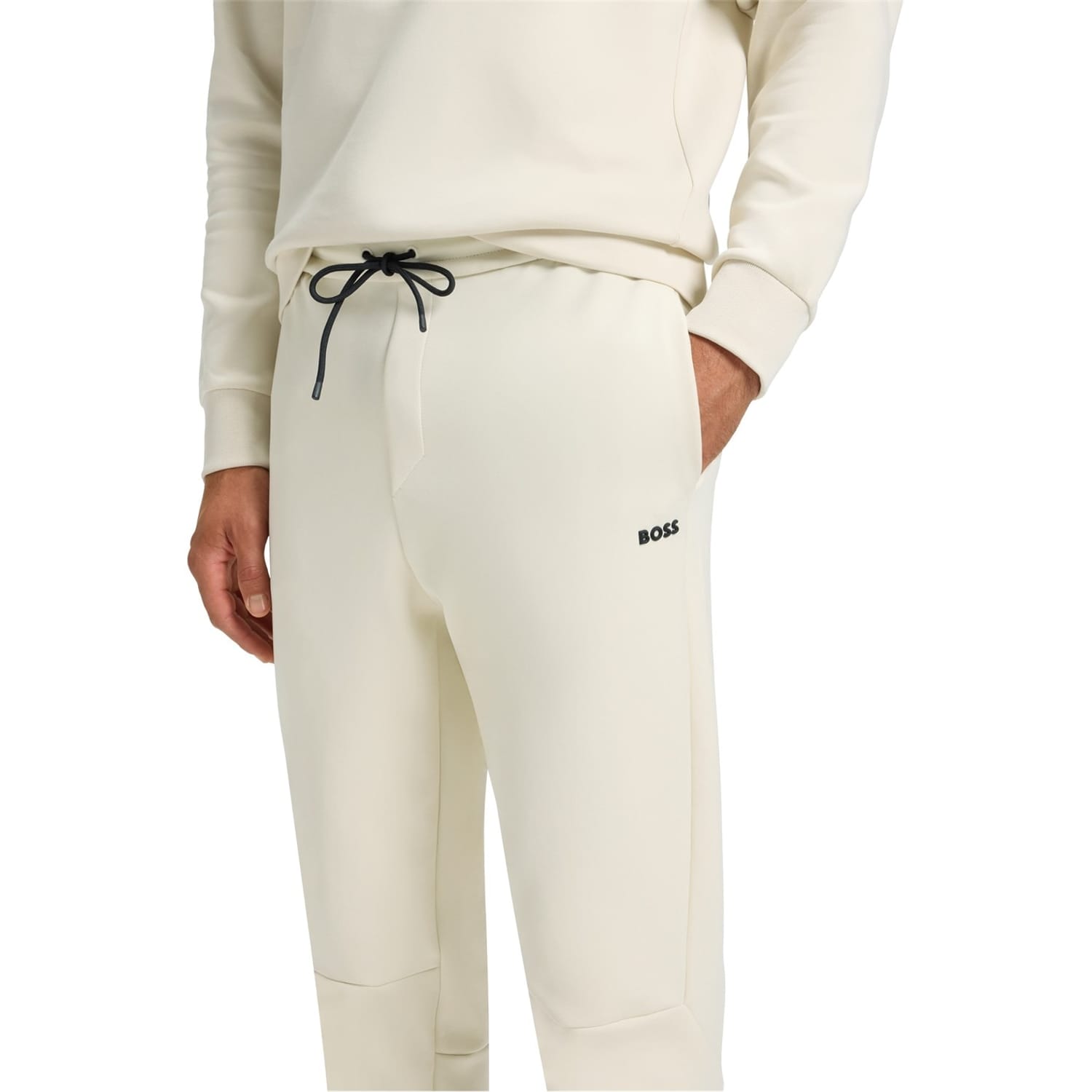Upgrade your off-duty style with the BOSS Tapered Jogging Bottoms. Crafted from a soft cotton-blend with added stretch, they feature cuffed hems, sporty stripe detailing, and a moulded logo for a sleek, athletic edge. The regular fit ensures all-day comfort, making them a versatile essential. Perfect for weekend lounging, travel days, or casual catchups with friends.