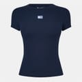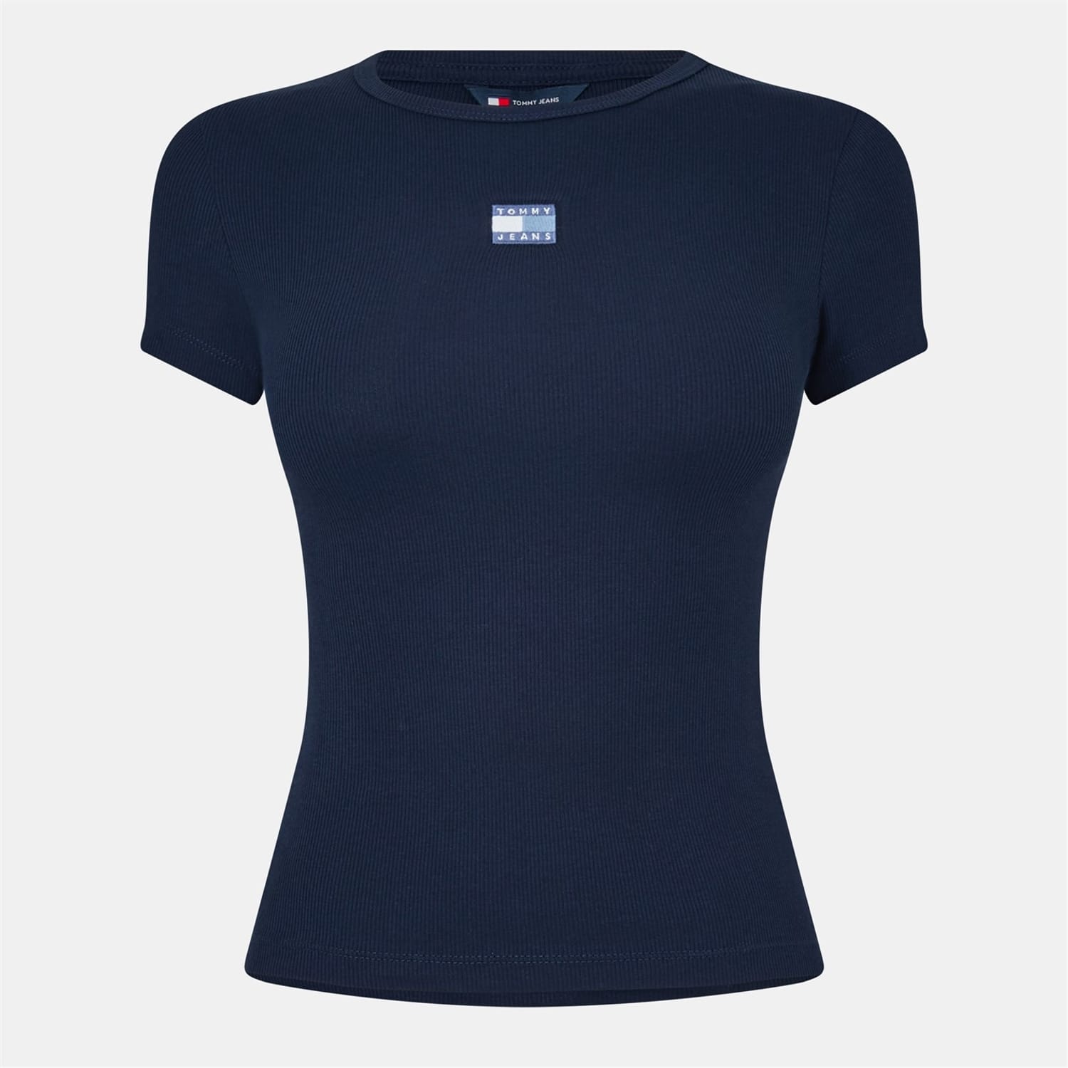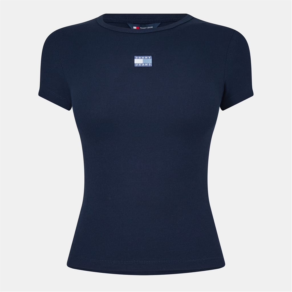 Discover the Tommy Jeans top, featuring a ribbed pattern and a regular fit. This short-sleeve design is adorned with a badge and logo, adding a distinctive touch. The rib crew neck enhances its classic appeal, making it a versatile addition to your wardrobe. -