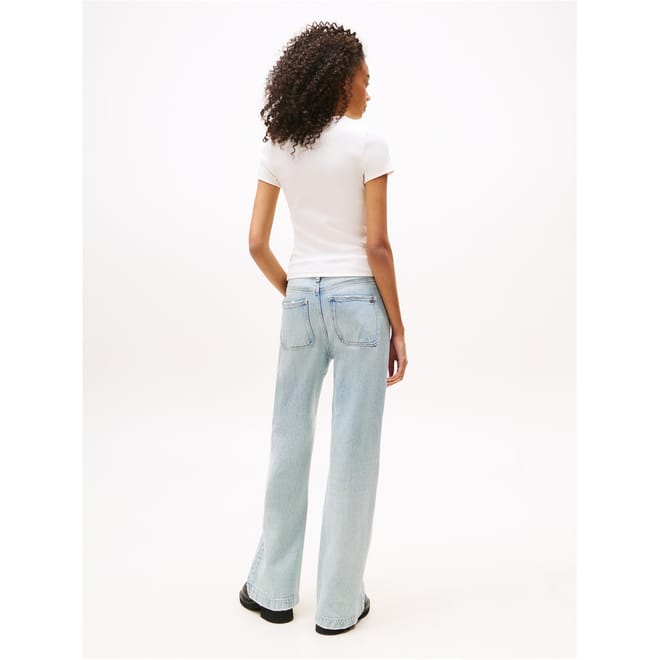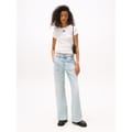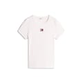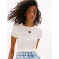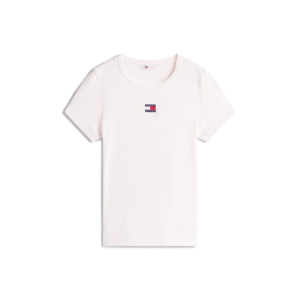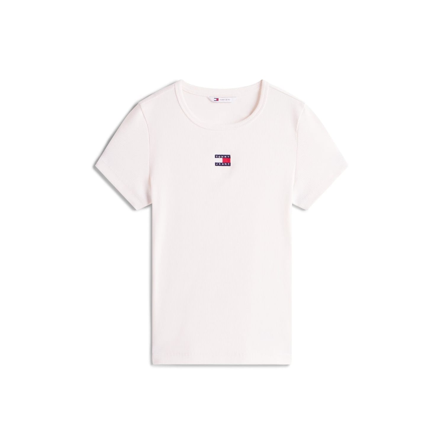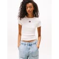 This Tommy Jeans top features a regular fit with a ribbed pattern, offering a stylish yet comfortable look. The short sleeves and crew neck design add to its casual appeal. Embellished with a distinctive badge and logo, this top is a perfect choice for those who appreciate subtle branding. -