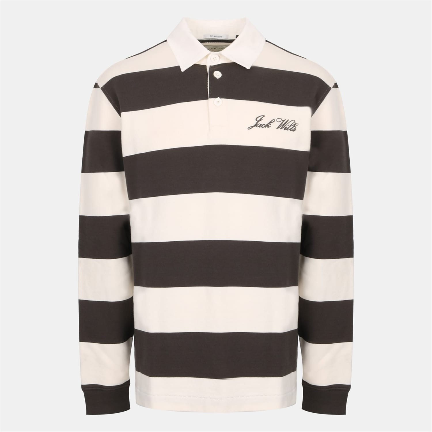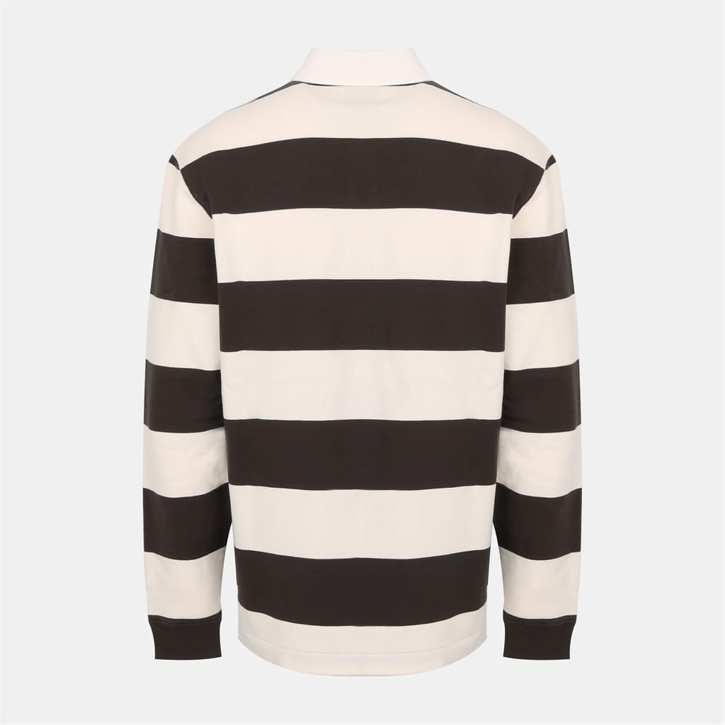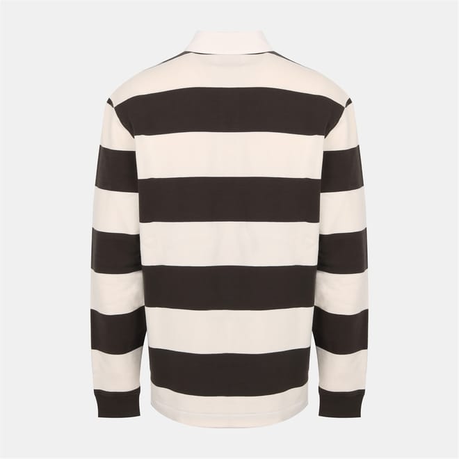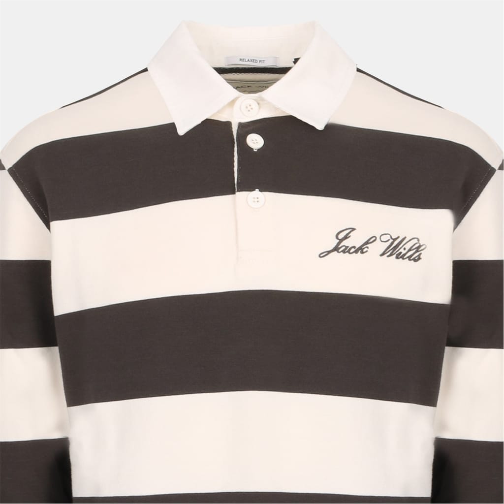 This Jack Wills top features a relaxed fit with long sleeves and a ribbed cuff. The polo collar adds a classic touch, while the front button closure ensures ease of wear. The horizontal stripe pattern is complemented by embroidered details and Lacoste lettering, creating a stylish and distinctive look. -