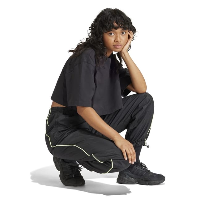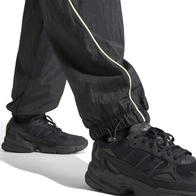 adidas Originals joggers feature a wide-leg cut and a drawstring closure for a comfortable fit. These parachute-style joggers are adorned with a logo embellishment, adding a touch of brand identity to your casual wardrobe. -