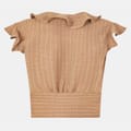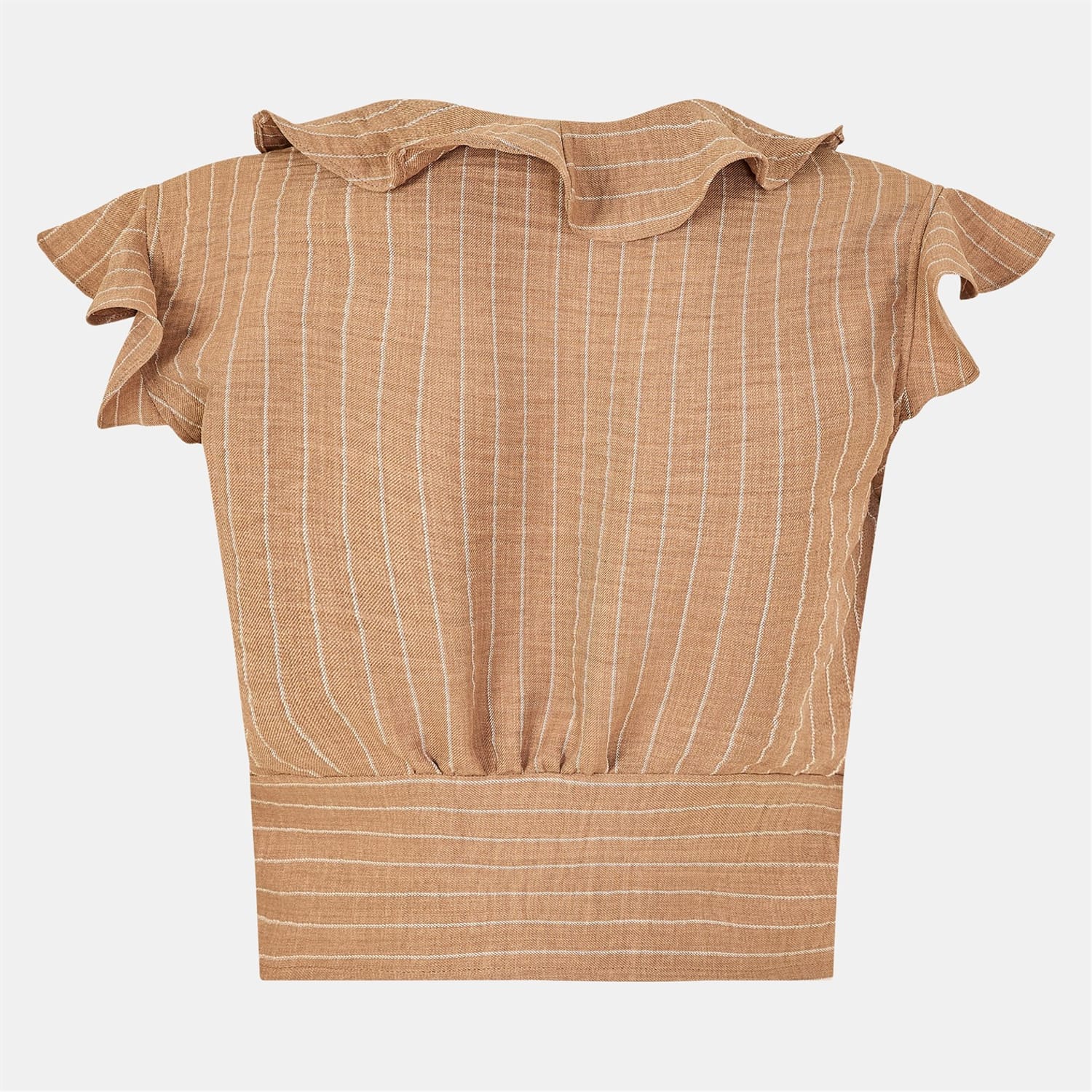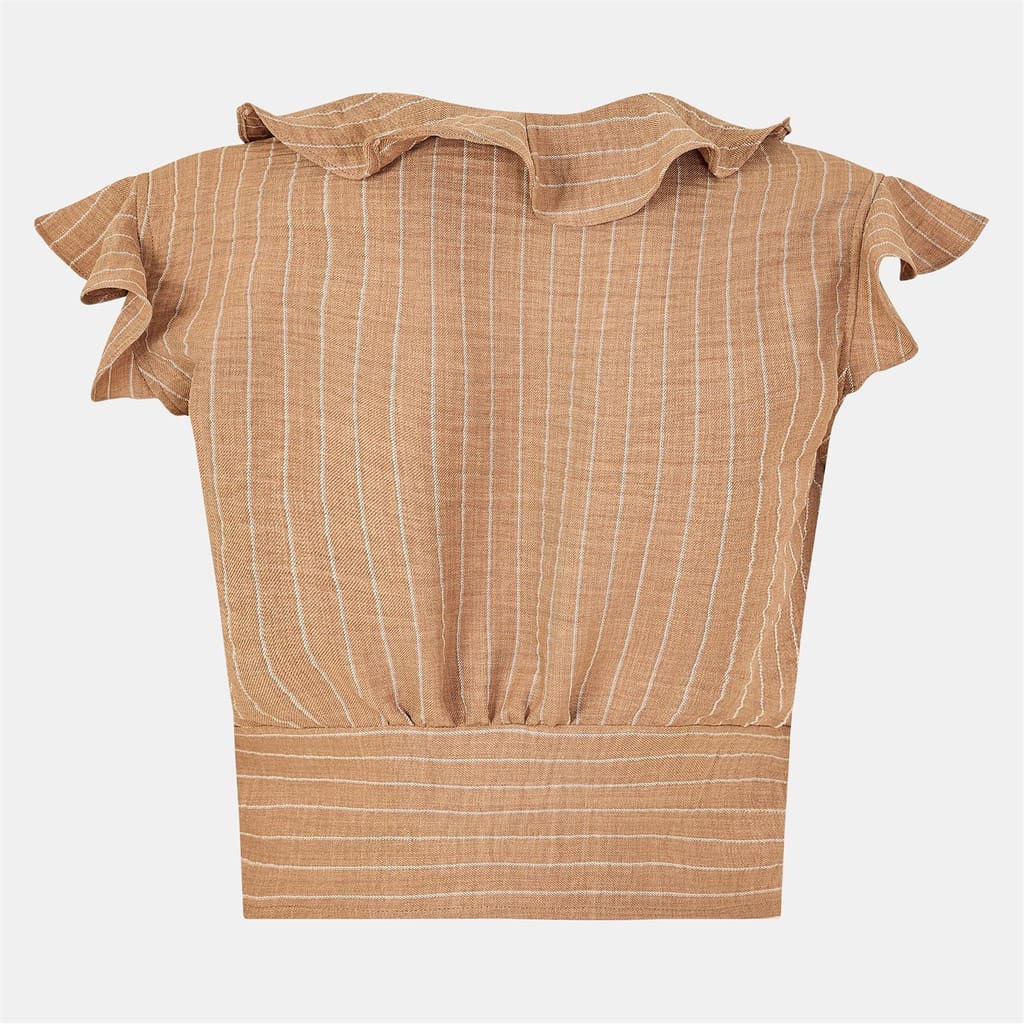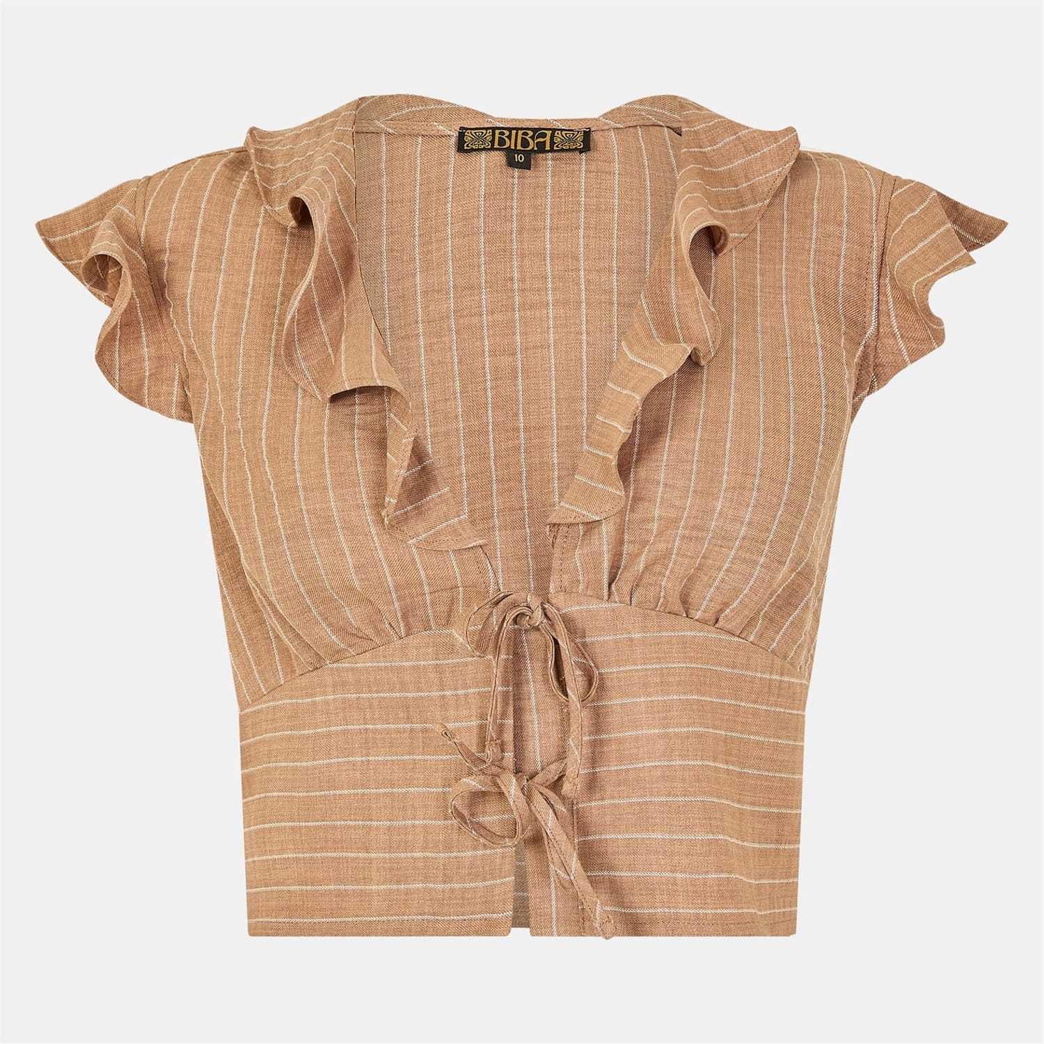 This Biba top features a stylish V-neck and a tie-front closure, offering a regular fit. The sleeveless design is enhanced with ruffle sleeves and embellishments, adding a touch of flair. The striped pattern adds a classic element to this elegant piece, making it a versatile addition to any wardrobe. -