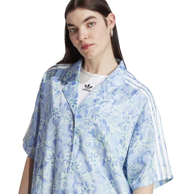 This adidas Originals top features a relaxed fit with short sleeves and a shirt collar. The floral pattern adds a touch of style, while the snap button closure ensures ease of wear. A practical pocket embellishment enhances its casual appeal, making it a versatile addition to your wardrobe. -