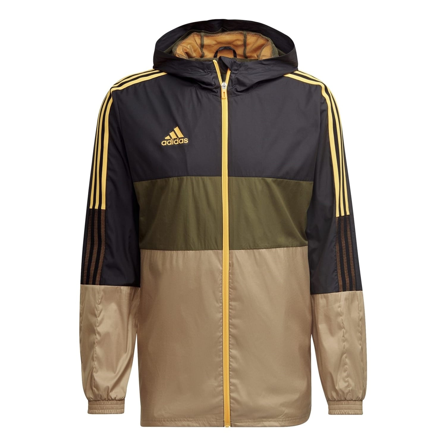 The adidas Tiro windbreaker is a versatile piece from the activewear collection. Featuring a hooded design, it offers a regular fit with a zipper closure. The color block pattern adds a stylish touch, while the elasticated cuffs and straight hem ensure comfort. Embellished with a logo and practical front and side pockets, this jacket is both functional and fashionable. -
