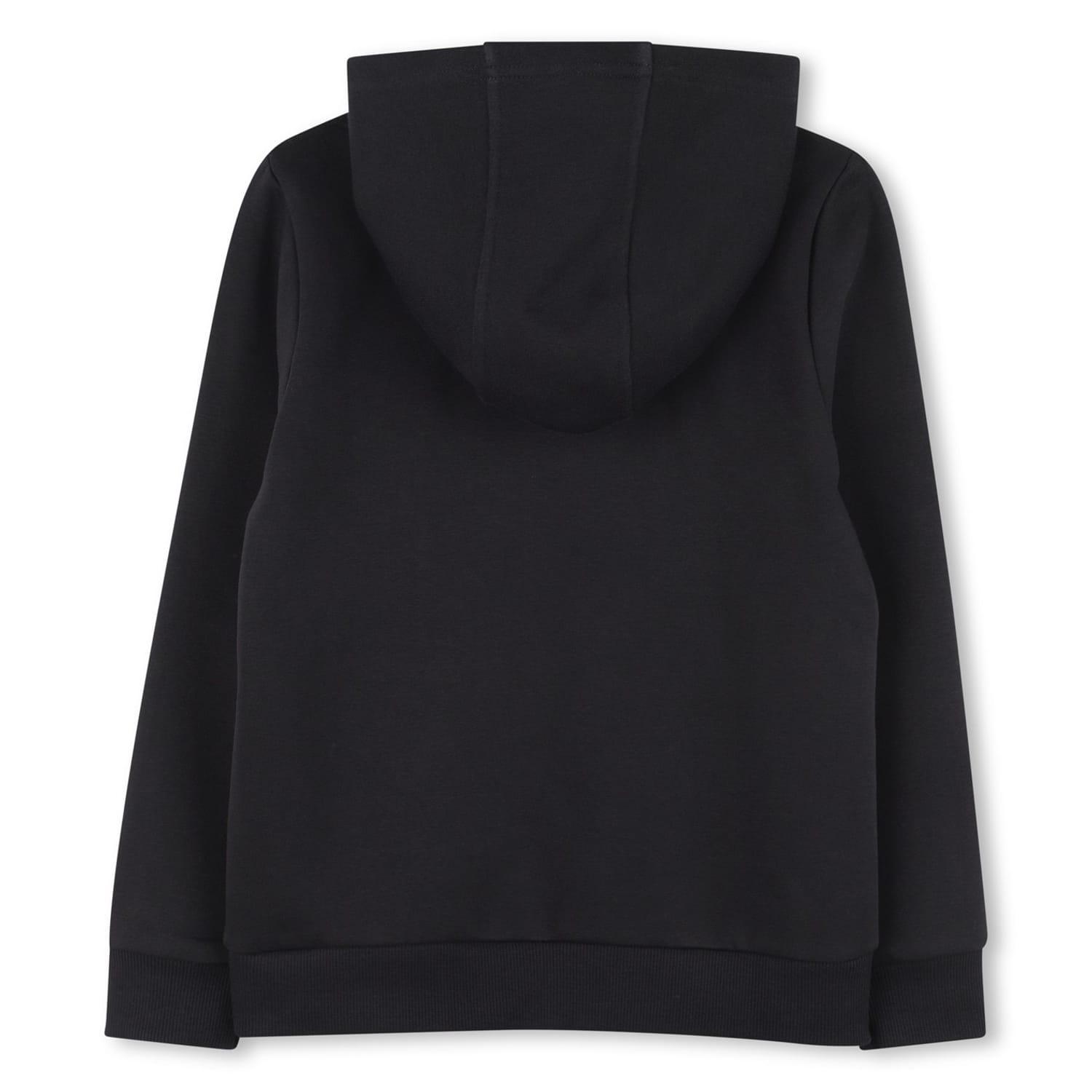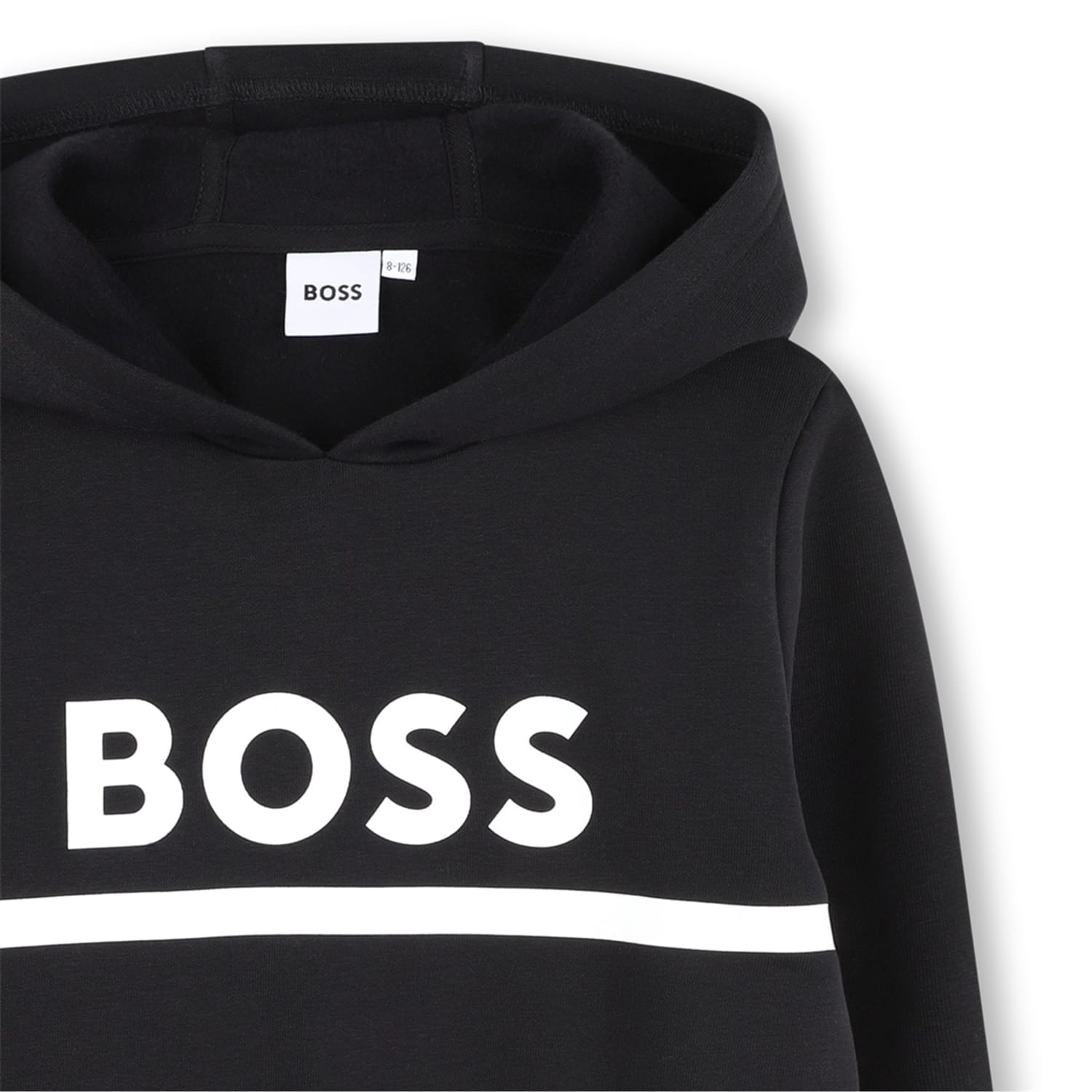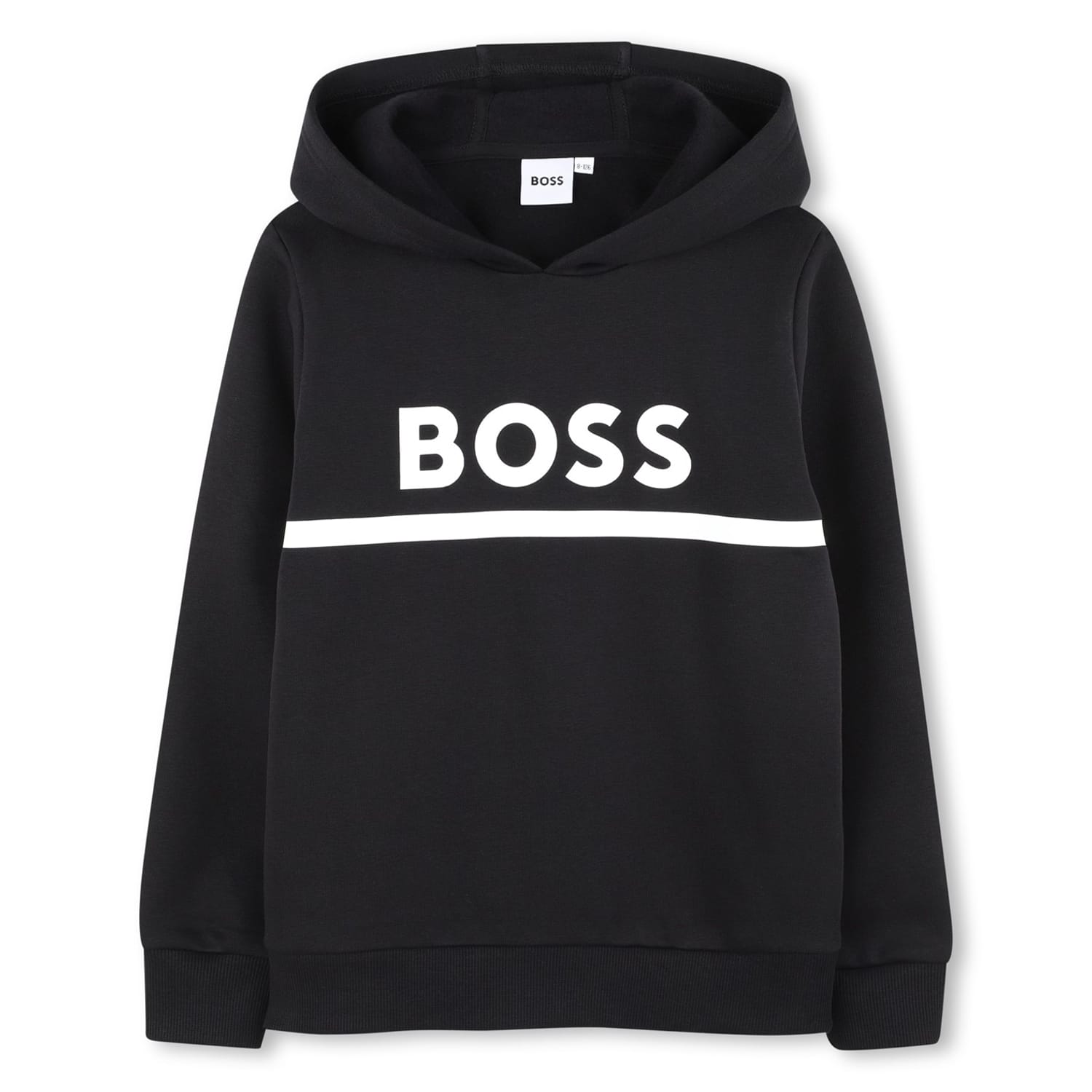 This Boss top features a hooded neck and long sleeves, offering a regular fit. The design is accentuated with a bold logo print, adding a distinctive touch. Ribbed cuffs and hem provide a comfortable finish, while the printed logo embellishment enhances its stylish appeal. -