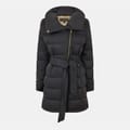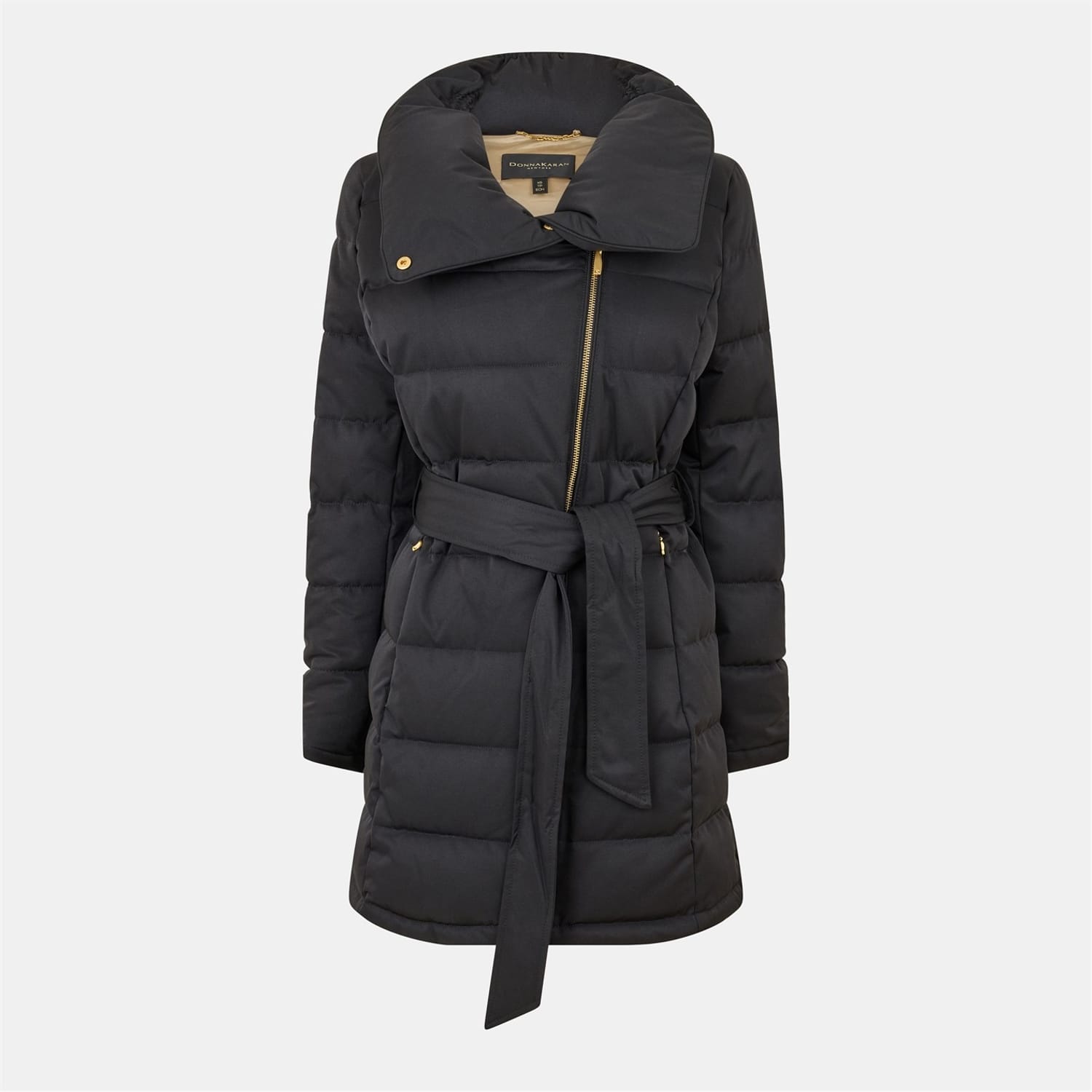 This Donna Karan puffer jacket combines style and functionality with its solid pattern and regular fit. Featuring a straight hem, it offers a sleek silhouette. The jacket is designed with a convenient zipper closure, complemented by a belt for added style and fit. Ideal for those seeking a blend of comfort and modern design. -
