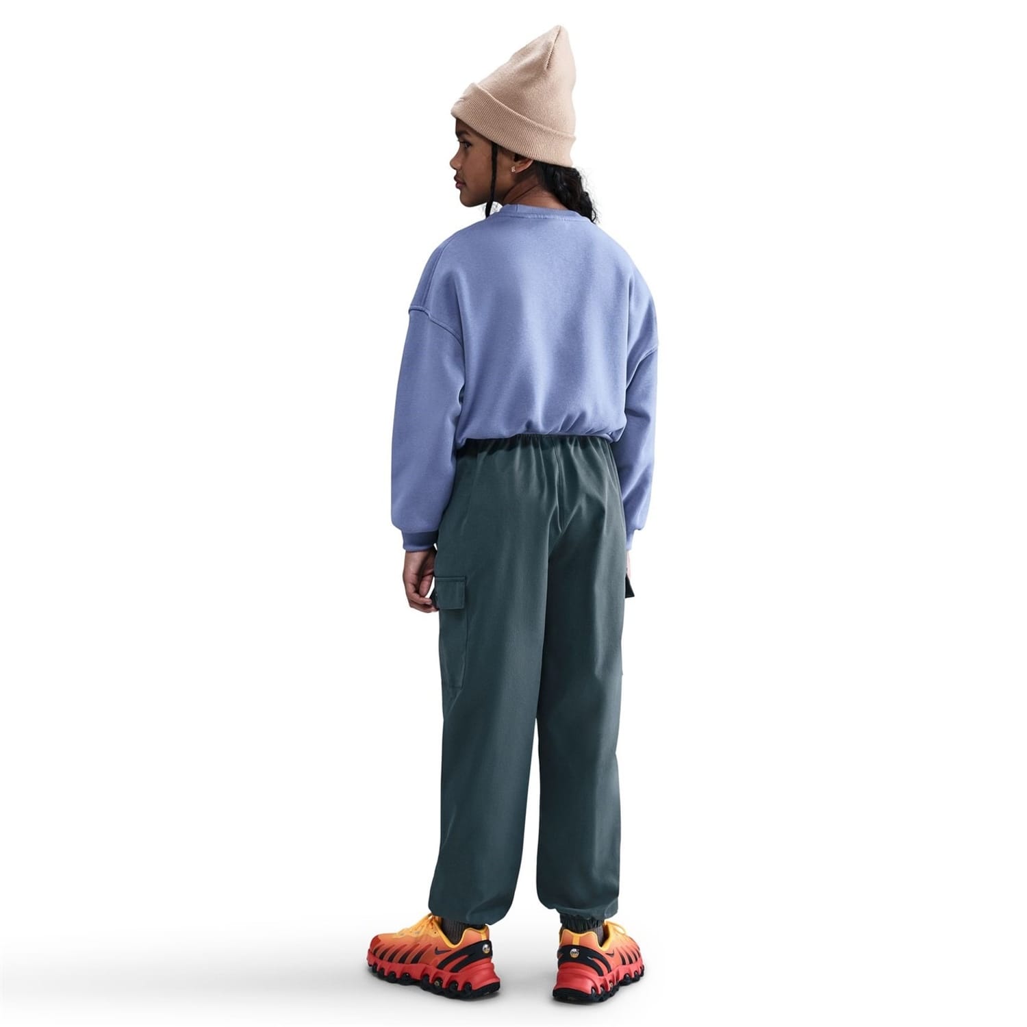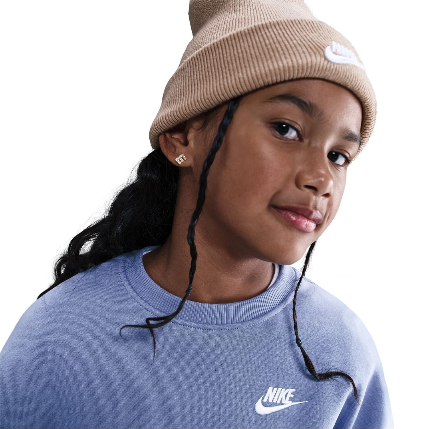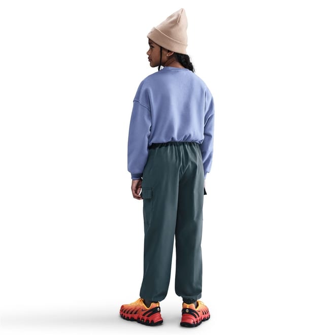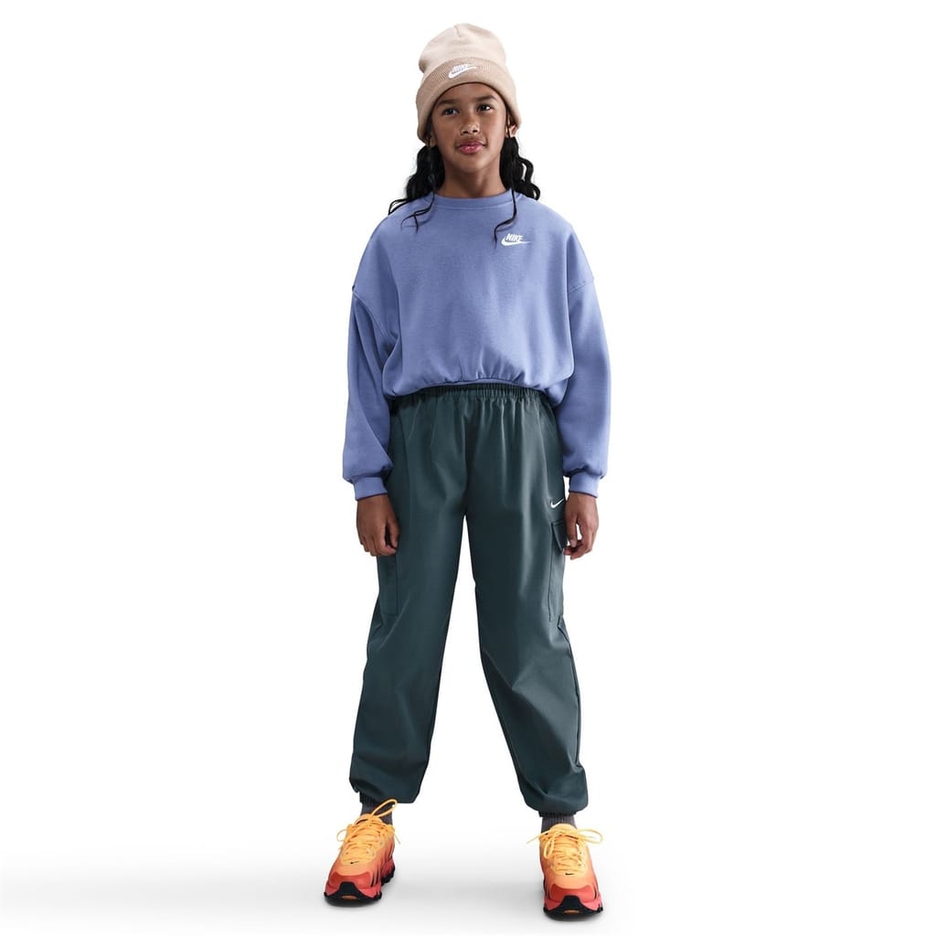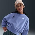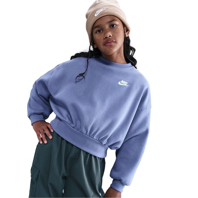 This Nike top for kids features a crew neck and a boxy fit, perfect for a relaxed look. The long sleeves with drop shoulder design and ribbed cuffs add a touch of style. Adorned with a logo, this solid pattern top is ideal for both sporting activity and club collections. -