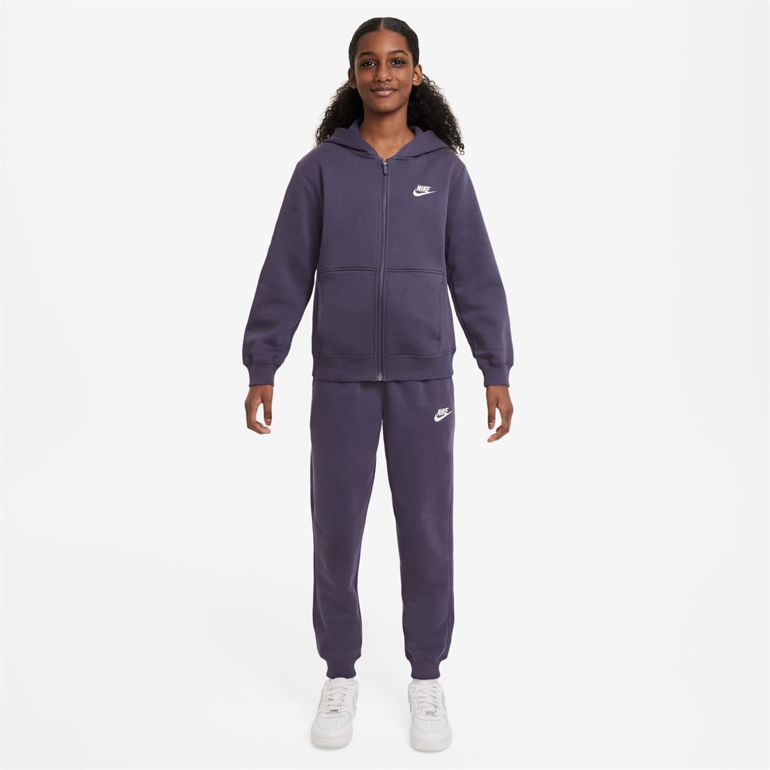 This Nike Fleece Tracksuit consists of a hoodie and joggers. The hoodie is crafted with zip fastening, long sleeves, a hood and 2 pockets. The joggers feature an elasticated waist, drawstring fastening, ribbed cuffs and 2 pockets. Both pieces in this set are designed with a signature logo and are complete with Nike Swoosh branding. -