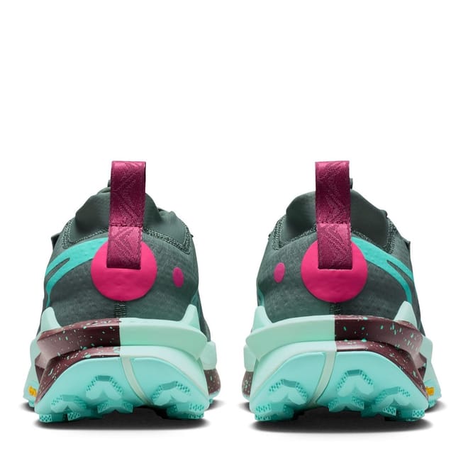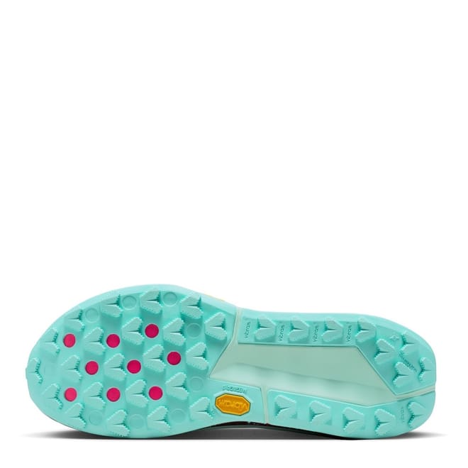 - Vibram Zegama outsole has a diverse lug pattern highlighted with wide spacing, providing traction for more technical terrains.