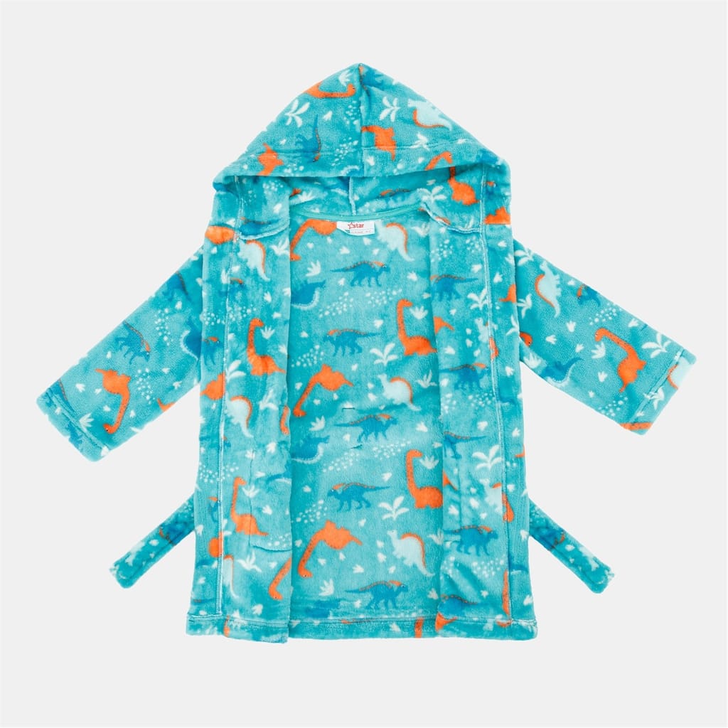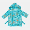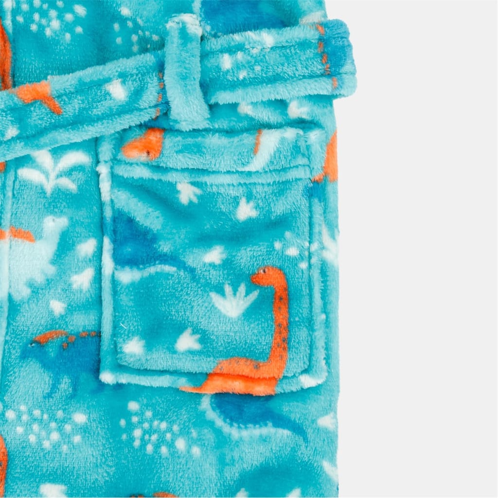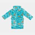 This adorable sleep robe features a fresh Tiffany blue base color adorned with playful orange dinosaur prints, complemented by blue dinosaur silhouettes and white botanical/starburst accents, creating a whimsical prehistoric jungle theme. These are fleece fabric with 100% Polyester robes suitable for boys. It is soft and comfortable to wear, which will make children happier.
