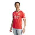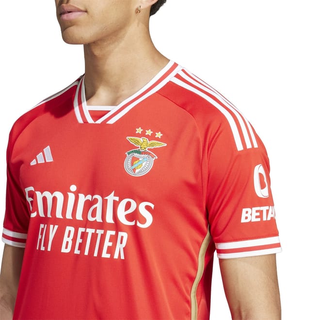 This adidas Benfica top is part of the domestic replica collection, featuring a solid pattern and a regular fit. It has a V-neck and short raglan sleeves with ribbed cuffs. The top is adorned with a logo and the iconic three-bar logo, making it a stylish choice for fans. -