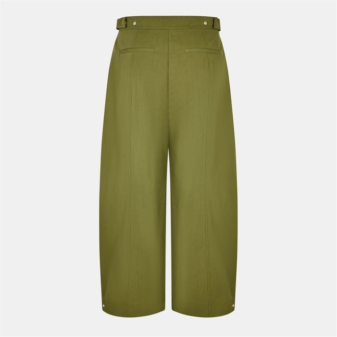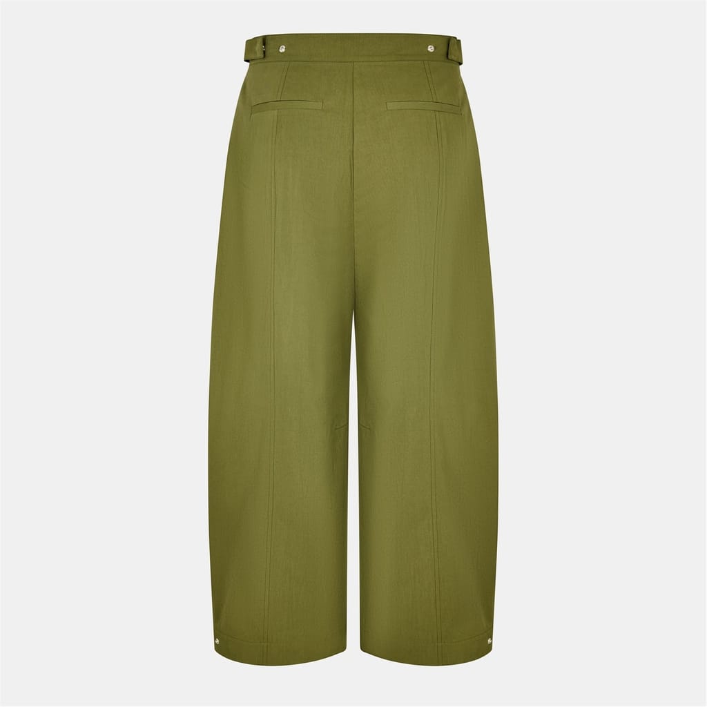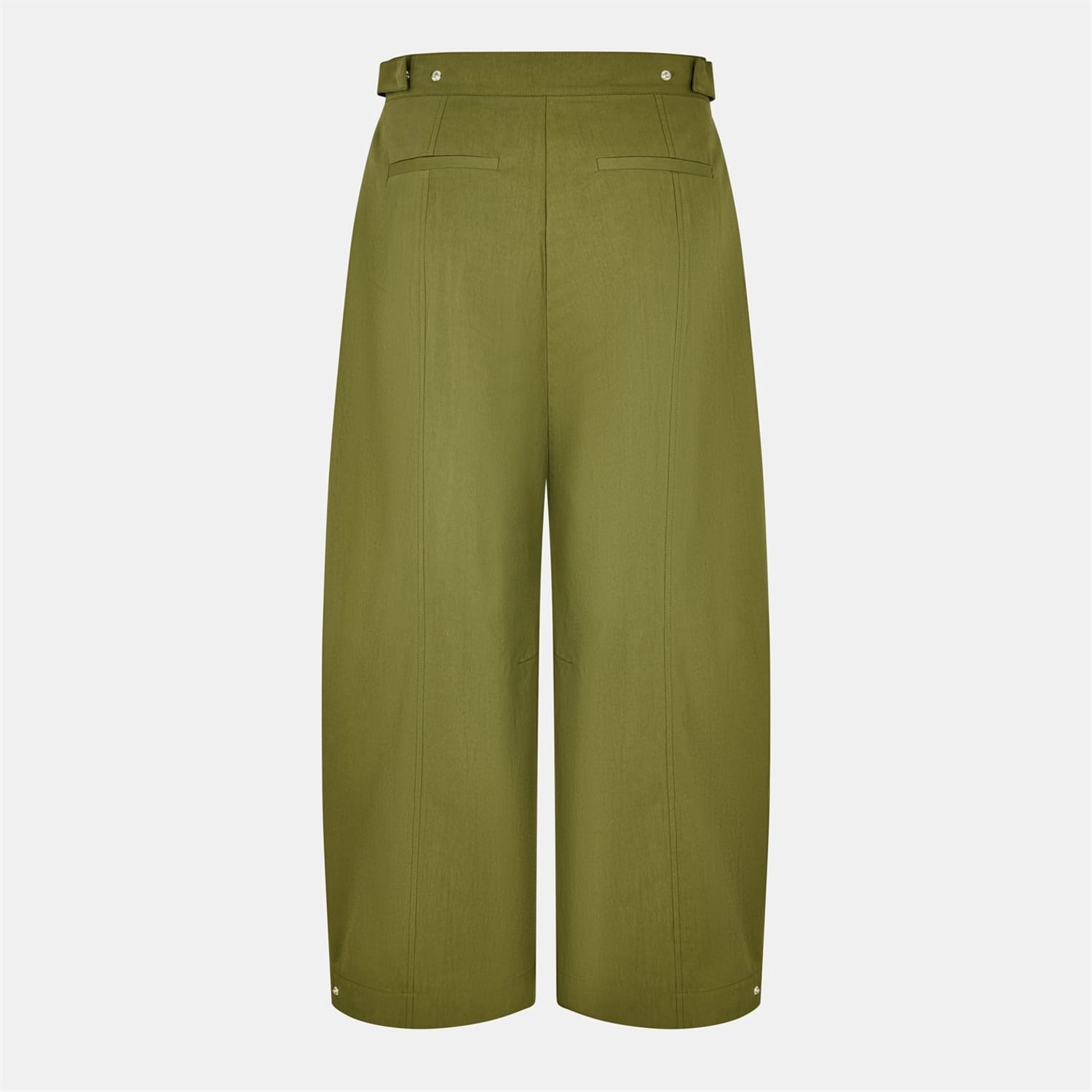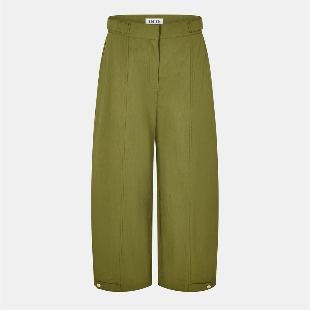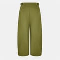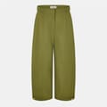 Wide leg green trousers with snap fastening on waist and bottom of hem, making them adjustable. Part of a co-ord outfit with the Agatha jacket.