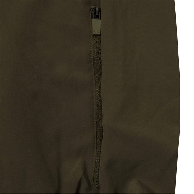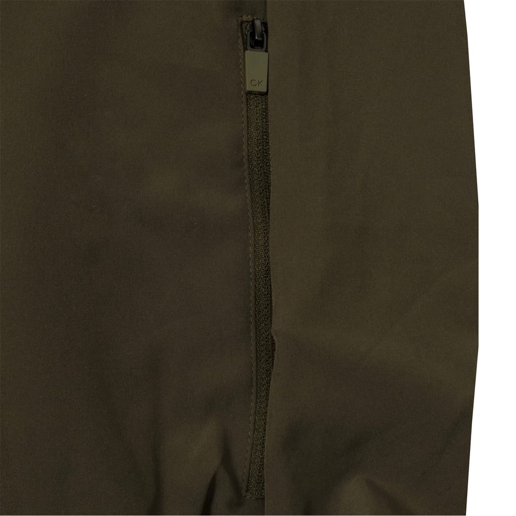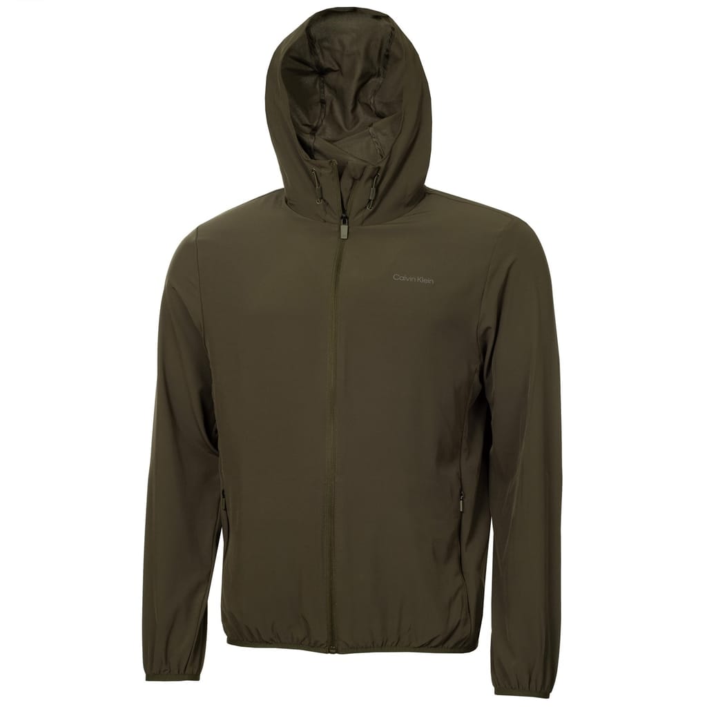 Calvin Klein Golf performance jacket features a hooded design with a zipper closure, offering a regular fit. The solid pattern is complemented by a straight hem and elasticated cuffs. A subtle logo embellishment adds a touch of brand identity. -