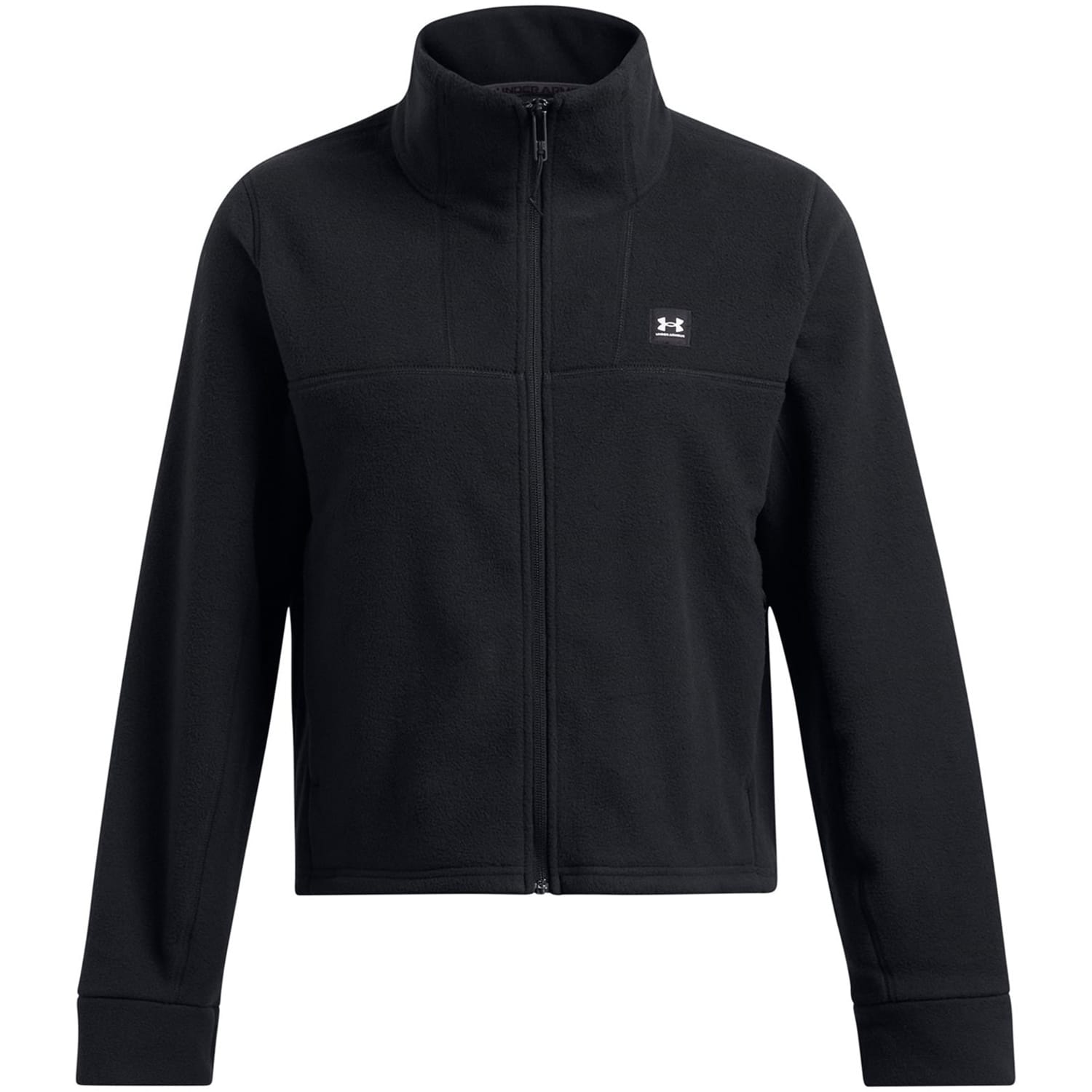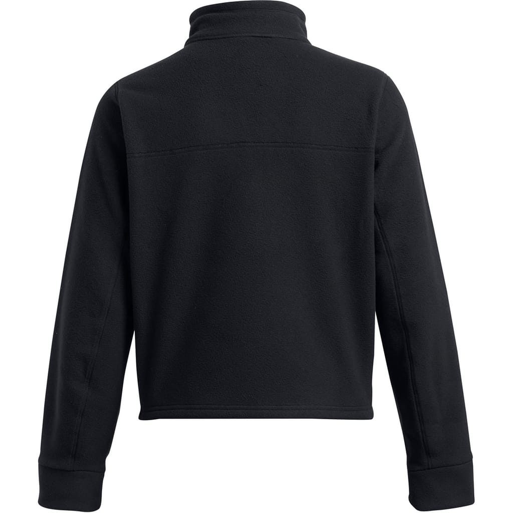 This Under Armour fleece jacket features a hooded design with a high collar and a full zipper closure. It offers a relaxed fit with a ribbed cuff and a straight hem. The solid pattern and logo embellishment add a touch of style to this short-length jacket. -