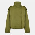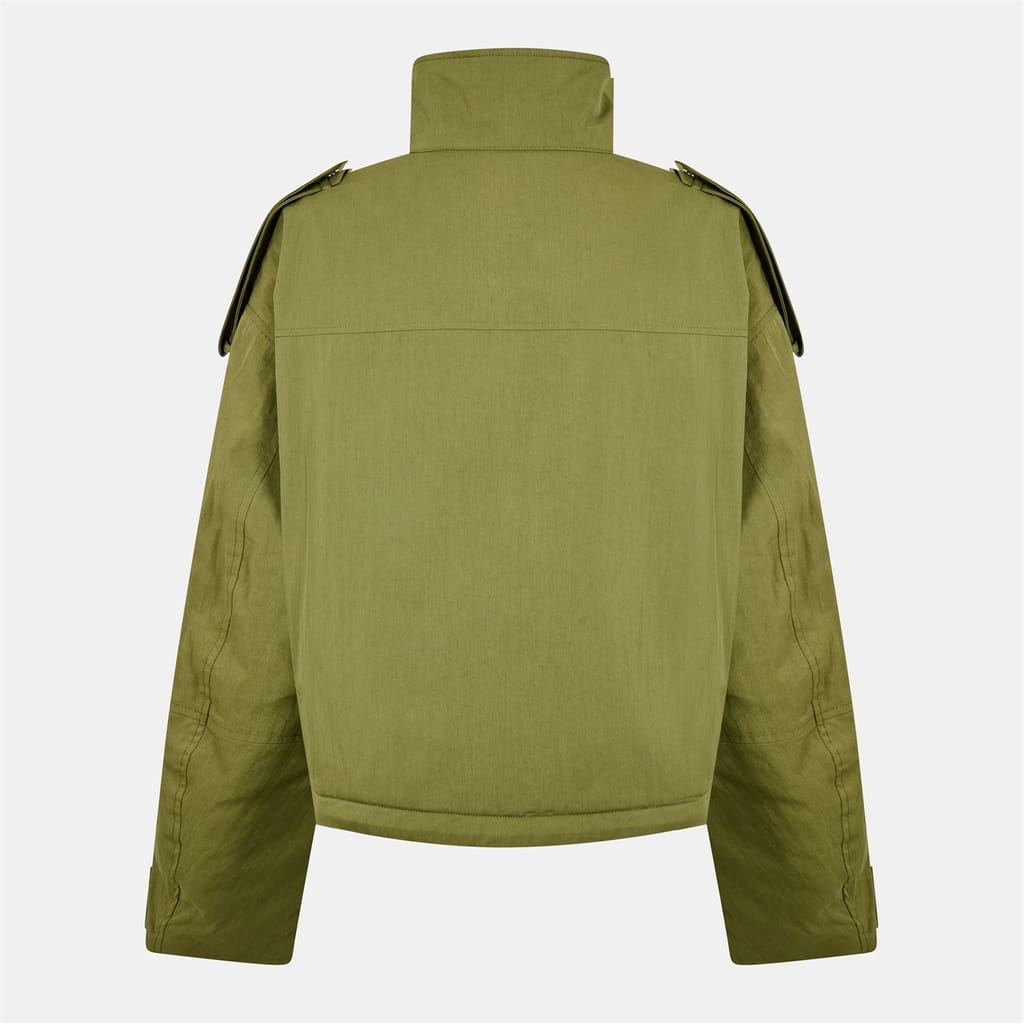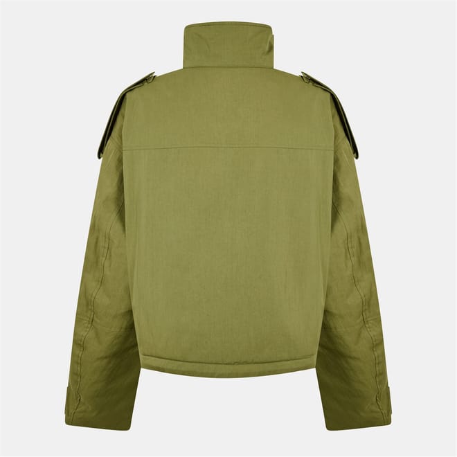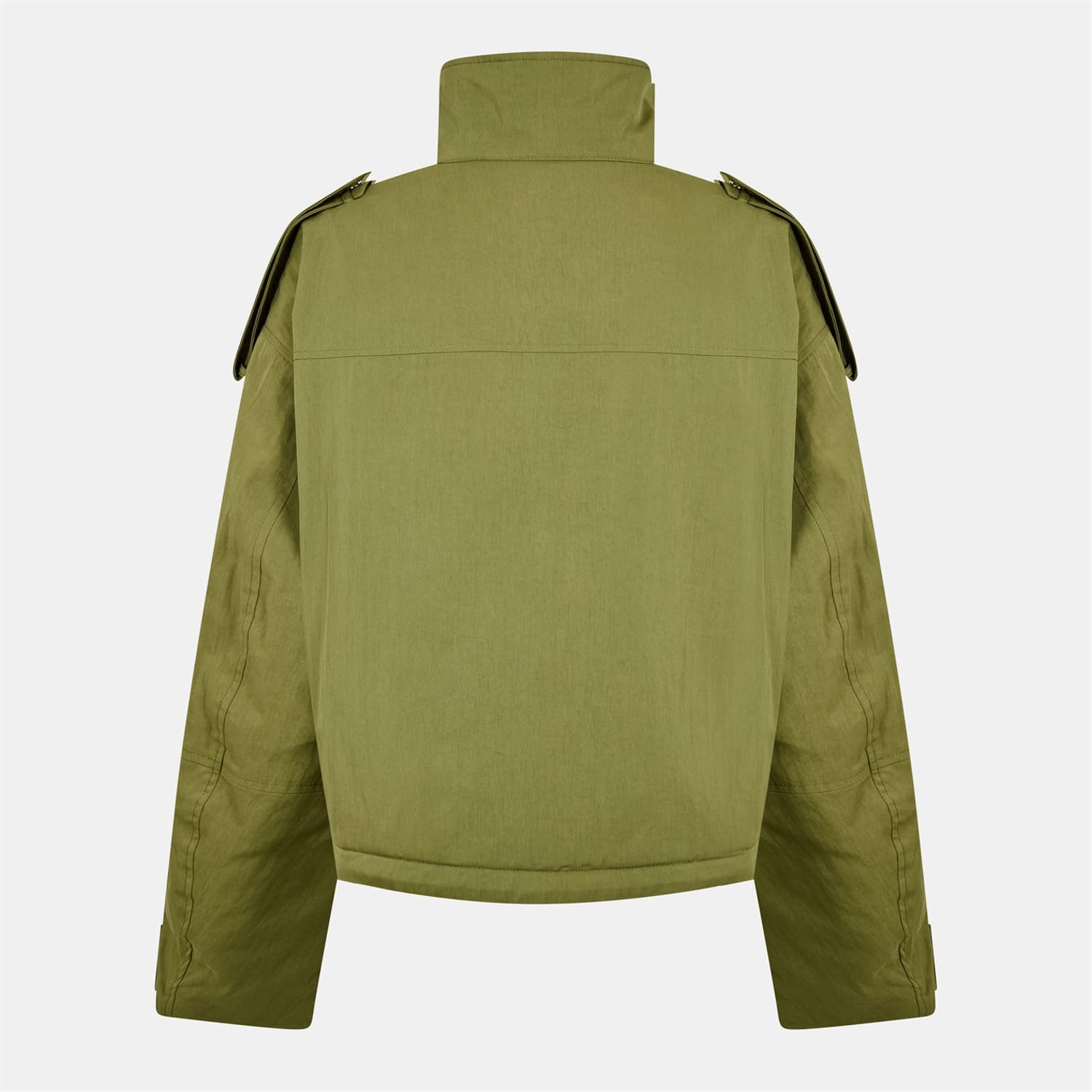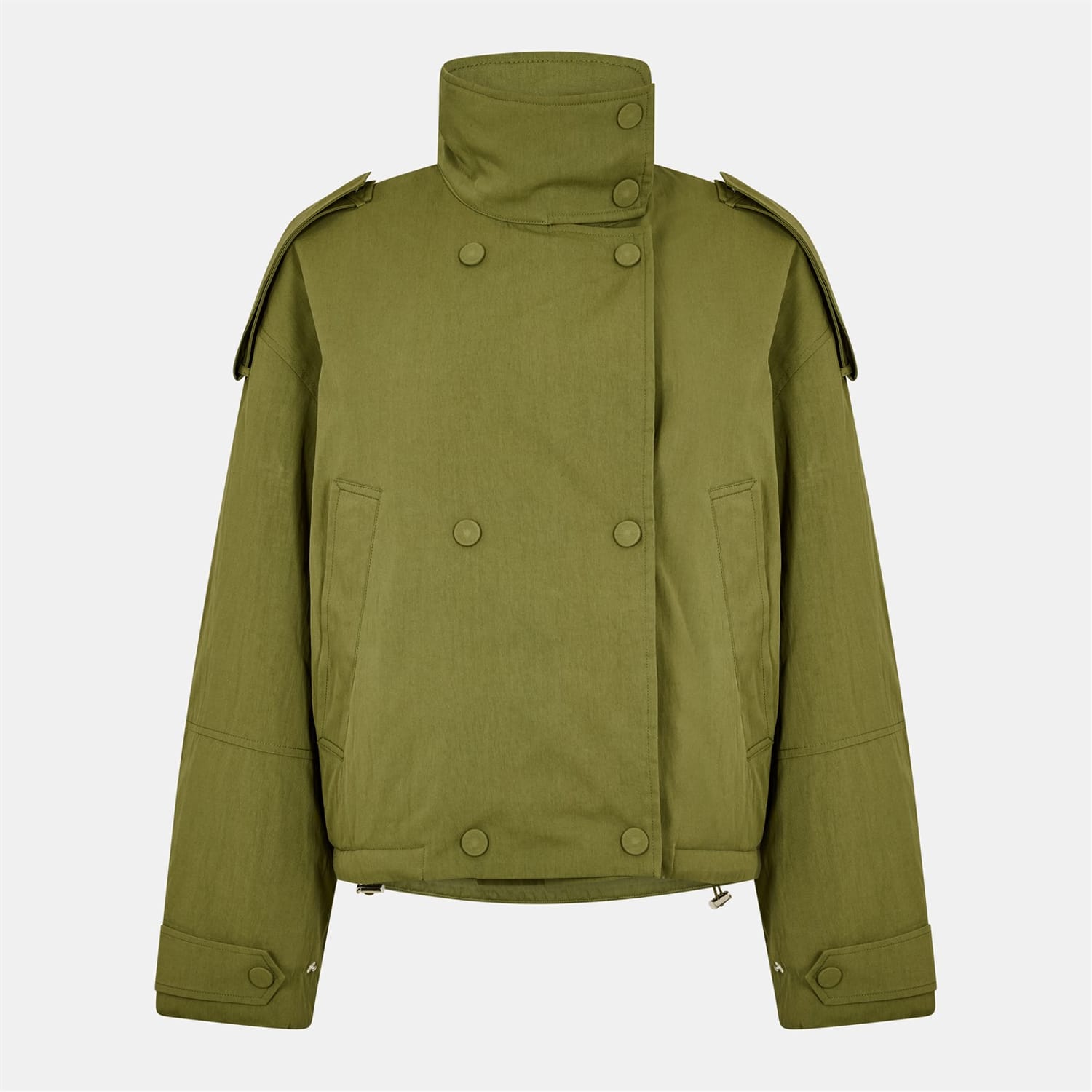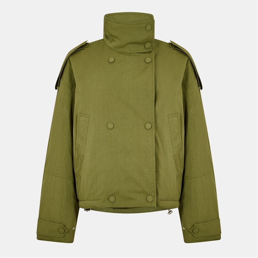 Cropped green, double breasted jacket with drawstring waist. Featuring a dropped shoulder with epaulettes, strap on the cuff and button fastening. Side pockets.